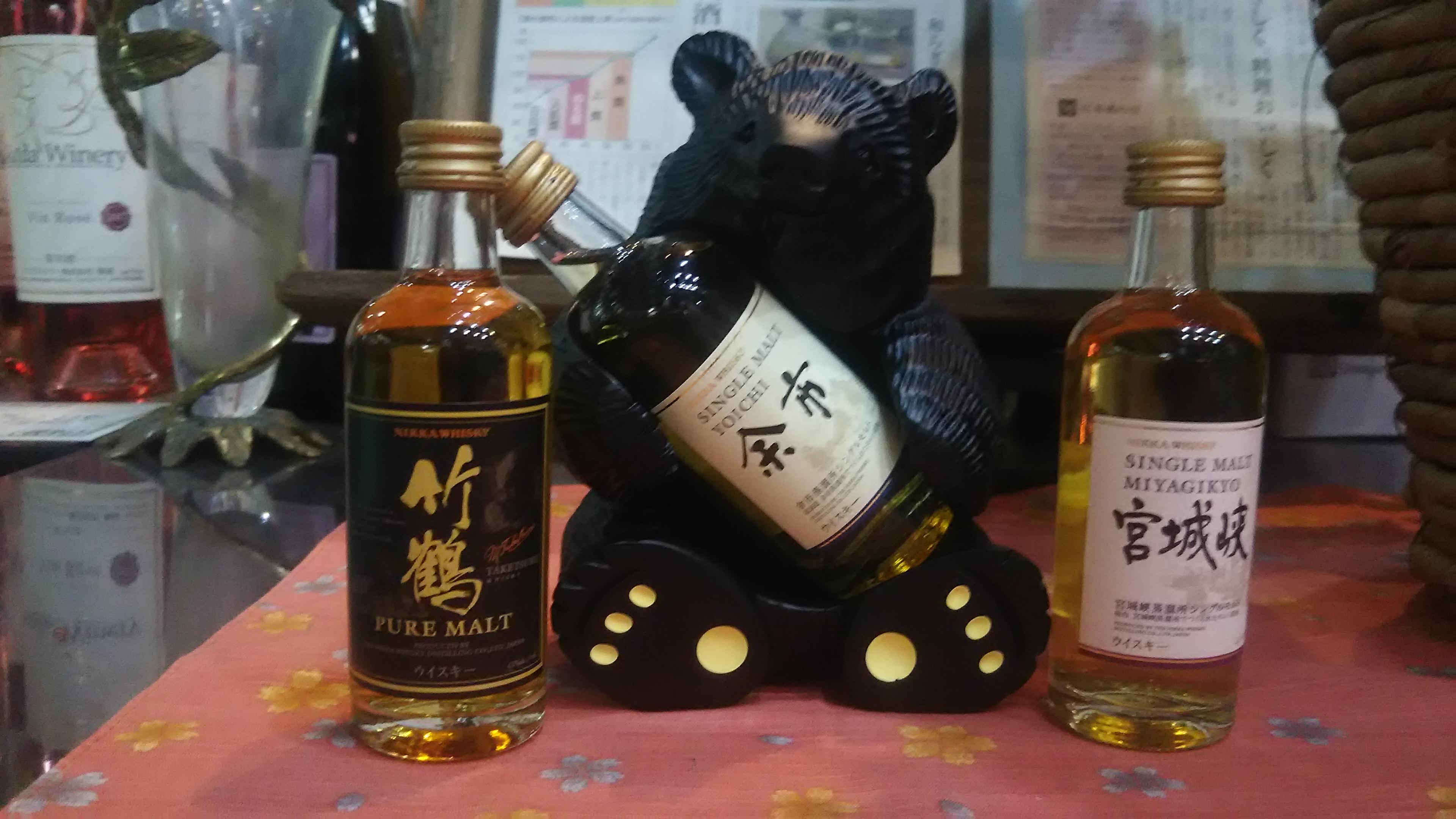 先日のGWを利用して札幌に行ってきました。北海道のお土産といったら今は『白い恋人』や『マルセイ・バターサンド』が人気ですが、一昔前は『木彫りの熊』が定番でしたよね。ニッカウヰスキー余市蒸溜所のお土産コーナーで、ウイスキーのミニチュアボトル抱いた熊の置物を発見し、お土産に買ってきました。今の熊は、木ではなくプラスチック製なんですね!ミニチュアボトルは5種類あって、その中の『余市』『宮城峡』『竹鶴』を買ってきました。日替わりで熊さんに抱いてもらおうと思います。