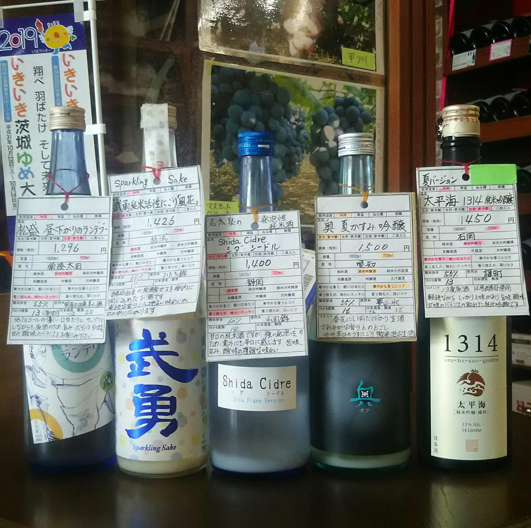 写真中央にあるブルーのボトルは、静岡の志太泉酒造さんが造った発泡純米酒『シダ・シードル』です。シードル(リンゴの発泡酒)のような甘みと酸味を感じさせることから命名されました。甘みの強いお酒ながら、強力なガスの発泡感で後口はとてもスッキリとしています。同じく、茨城の武勇さんからは、活性にごり酒『風花(かざはな)』が入荷しています。パステルカラーの水玉模様の可愛らしいラベル!爽快な香りと心地よい甘みが楽しめます。