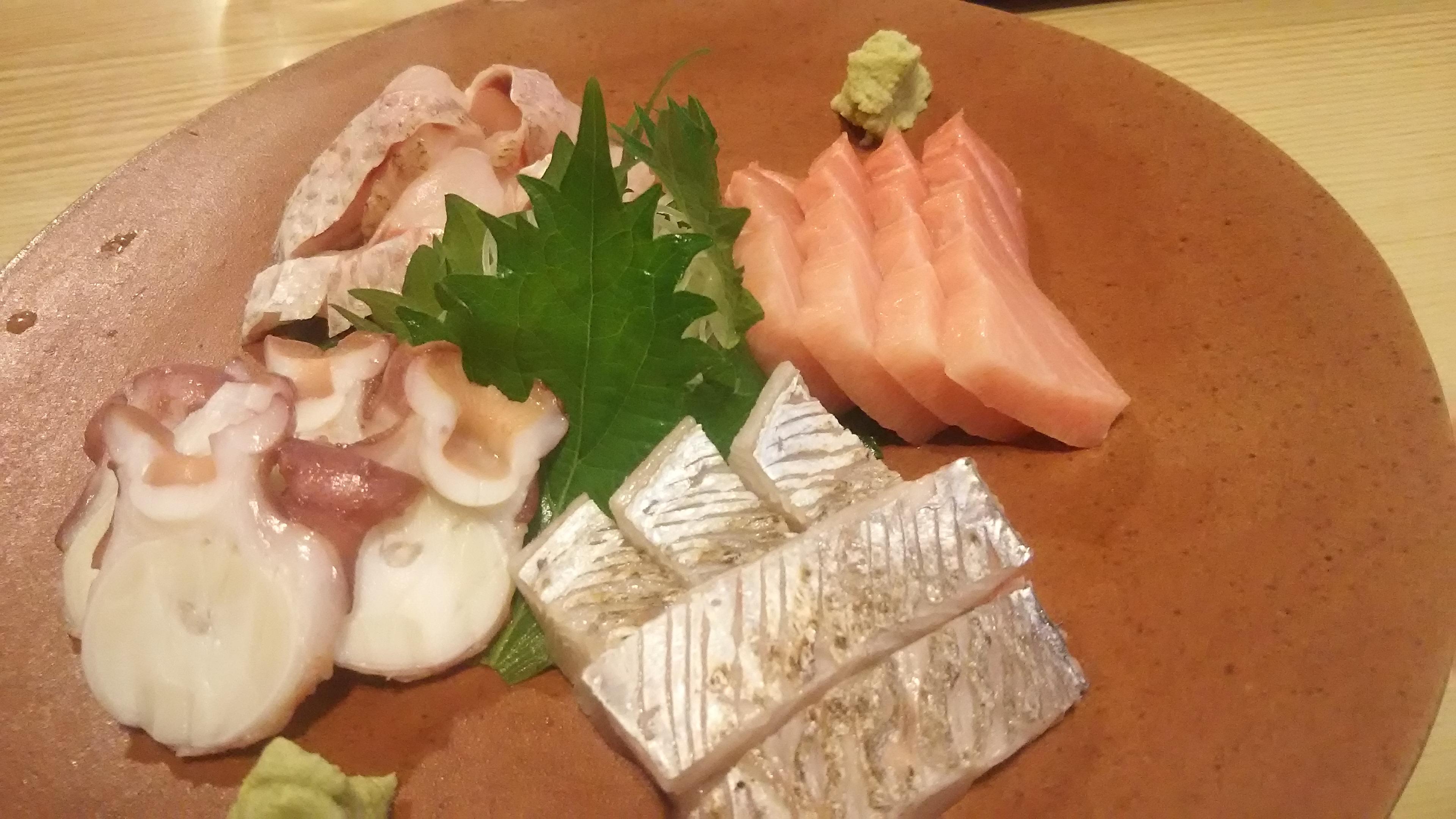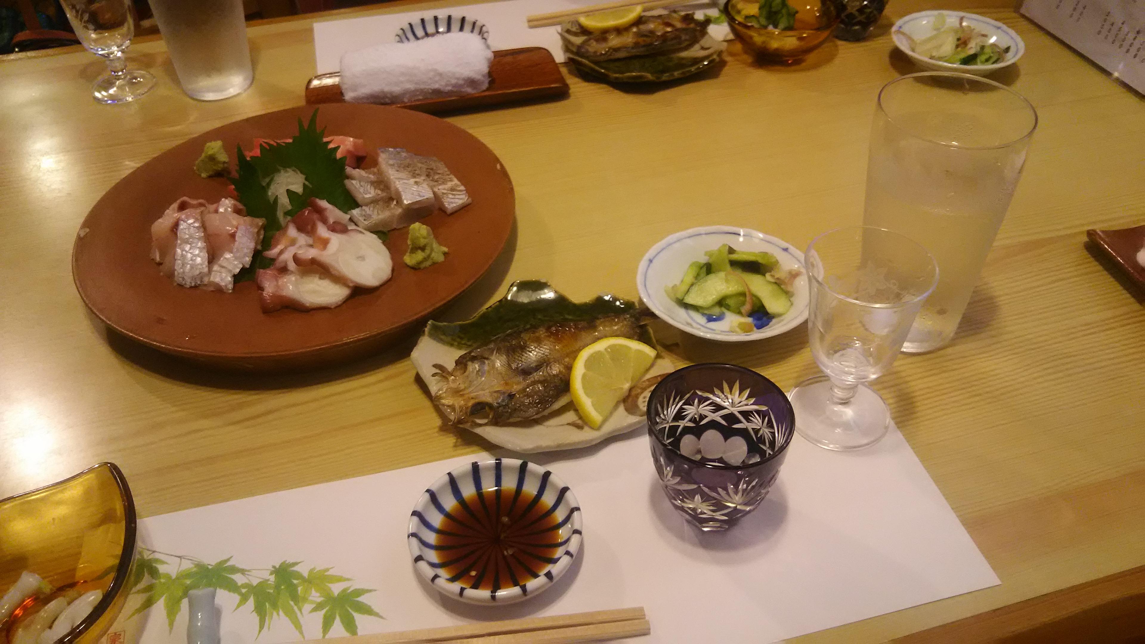 先ずは、地元の日本酒『渡舟』と『月の井』からスタートしました。こちらのお店は、ブログでもご紹介させていただいたことがありますが、常陸沖の新鮮な魚介類が楽しめる名店です。お通しのイカゲソ、浅漬に始まり、目光の一夜干し、そしてこの日のお刺身盛り合わせは、お寿司屋さんならではの、タコにマグロ、太刀魚にのどぐろ等、豪華四点盛!中でも、のどぐろの刺身はとろりとしていて抜群に美味しかったです!