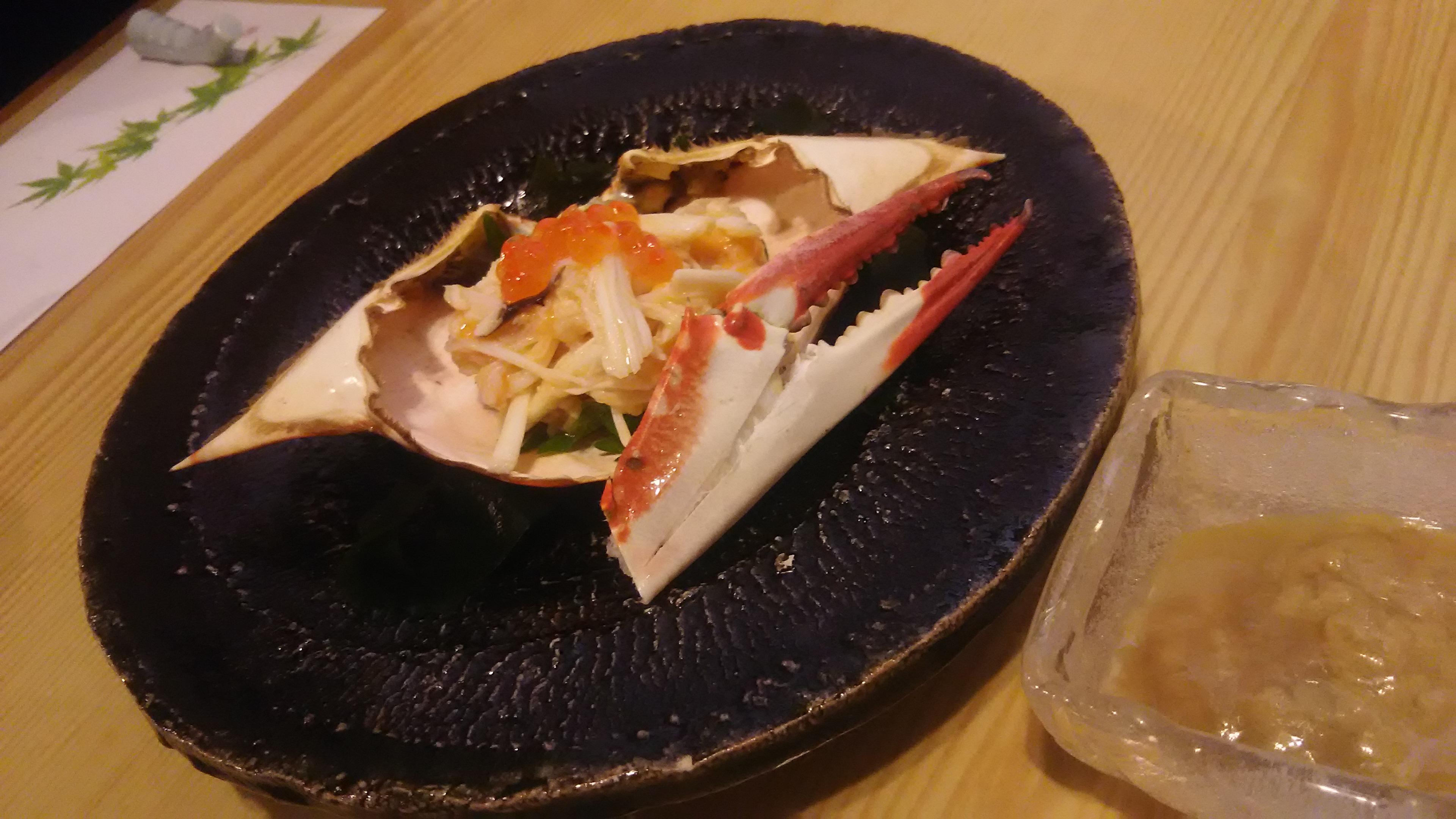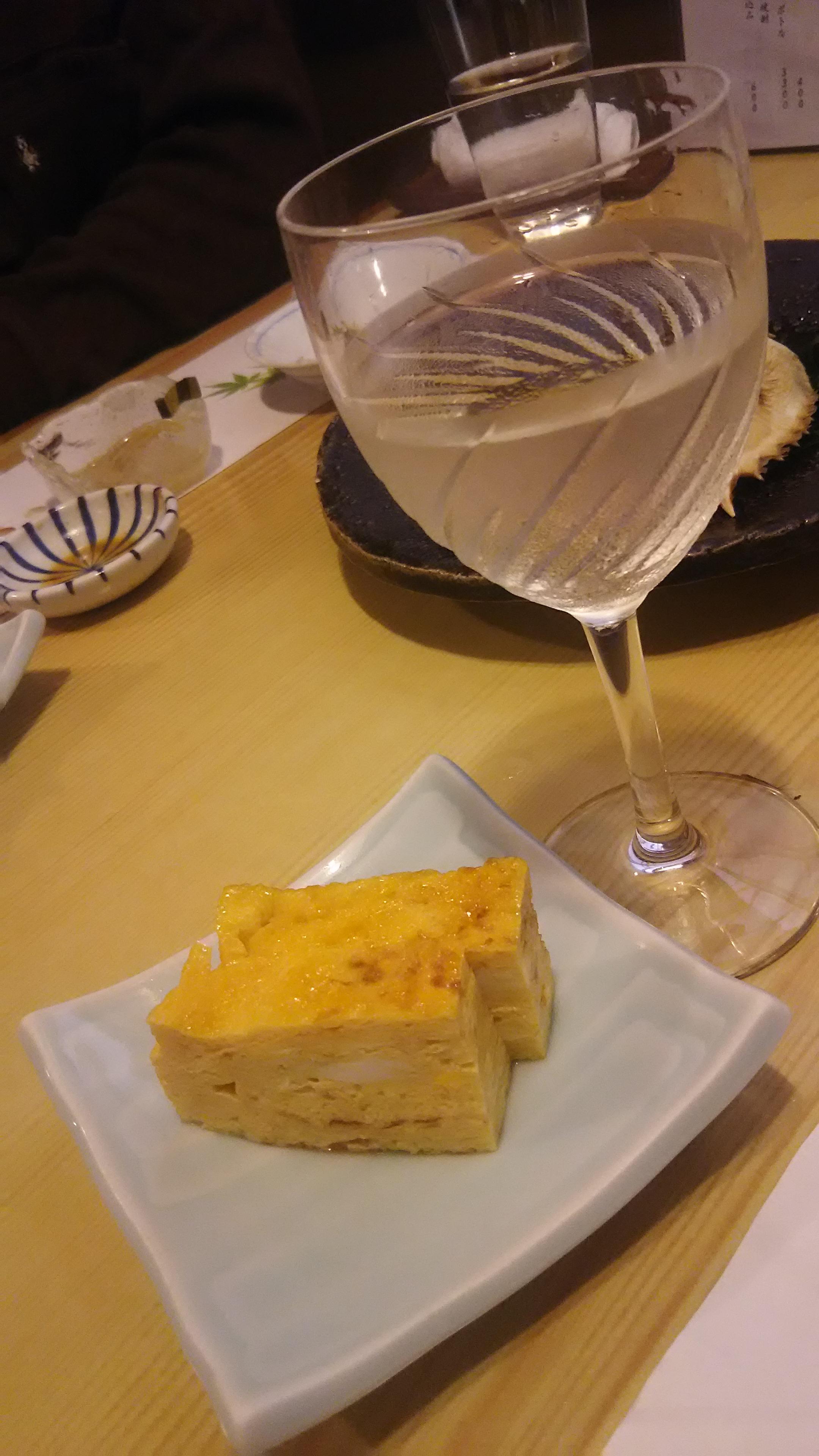 その後も、焼き立ての玉子焼きやワタリガニなど、お酒が進む料理が次々と運ばれてきて、テーブルがあっという間に一杯になってしまいました(笑)せっかくなら、ワインと一緒に味わおうという事で、辛口の白ワイン『イケダ・樽熟甲州』を頂きました。玉子焼きやお刺身との相性が良いのは分かっていましたが、カニ味噌や酒盗にも合うことが確認できました!