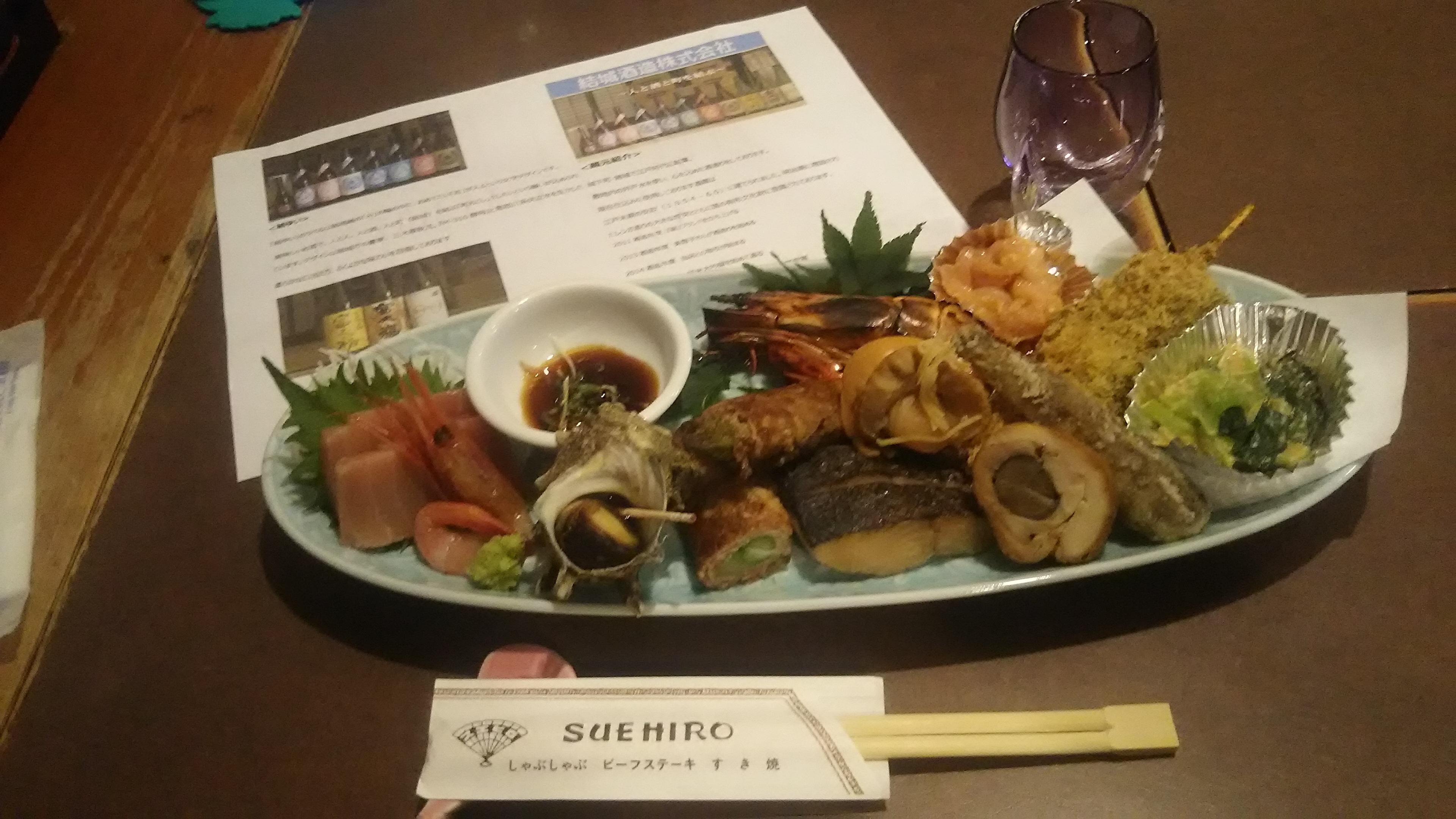 その後、純米大吟醸の3年分(2015、2016、2017)呑み比べを行い、最後には『お楽しみ大抽選会』で大いに盛り上がりました。会場となりました銀座スエヒロ様のお料理は毎回好評を頂いており、今回も期待を裏切らない美味しさでした。簡単にメニューをご紹介しますね。前菜は豪華8点盛、プラスお造り2点盛、生ハムとレタスのサラダ、アユの田楽、一口ステーキ お茶漬けです。