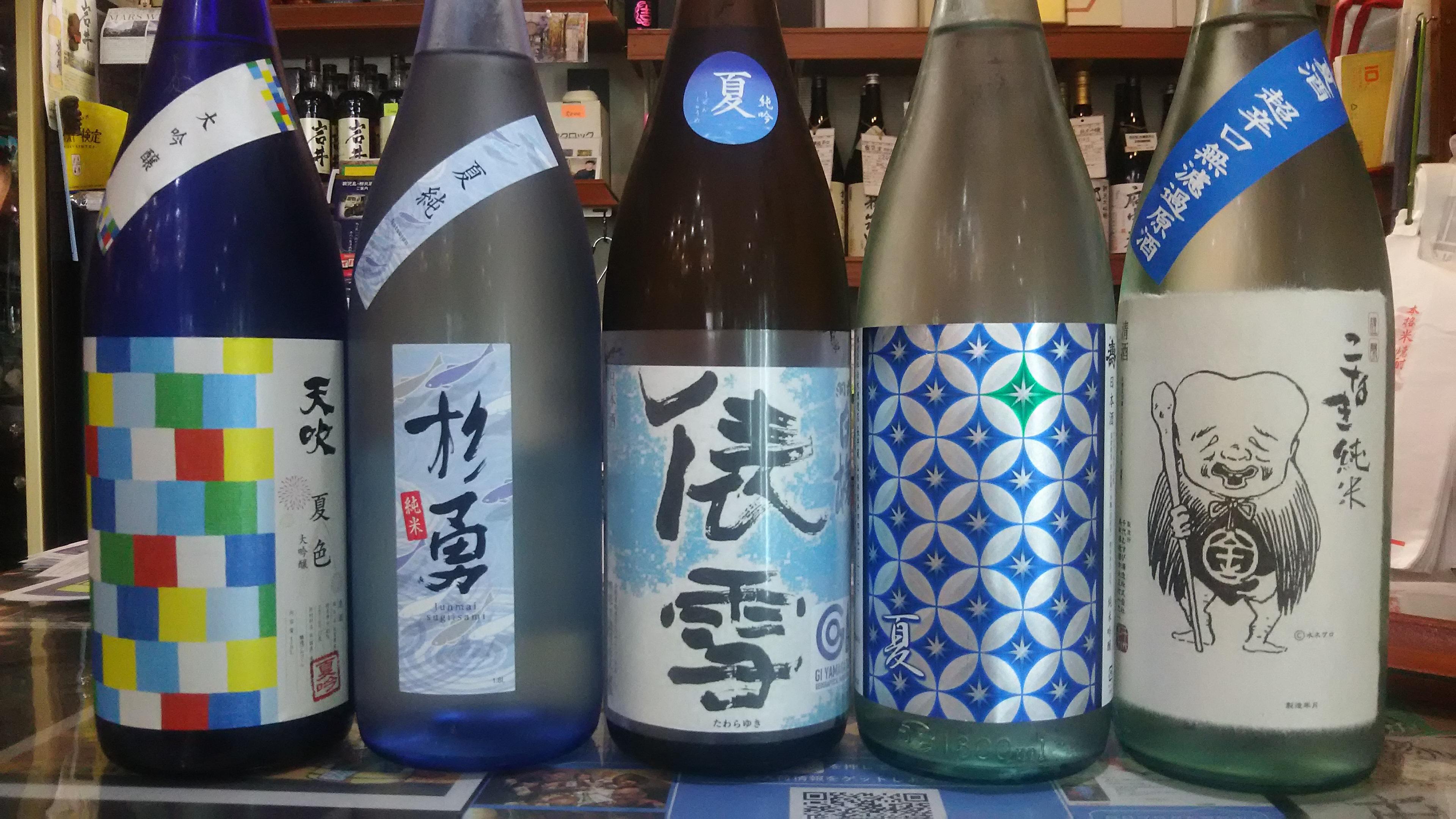 今年は、『春』と『夏』を意識した商品が特に多く、私の店に入荷してきた『夏酒』だけでも30銘柄以上に上ります。その大半は、ブルーや透明瓶に詰められたものが多く、ラベルデザインも爽やかな色味の物やきらきらと光る素材の物が目立ちます。中でも印象的なのが、名前やラベルに『夏』の文字を入れた商品です!