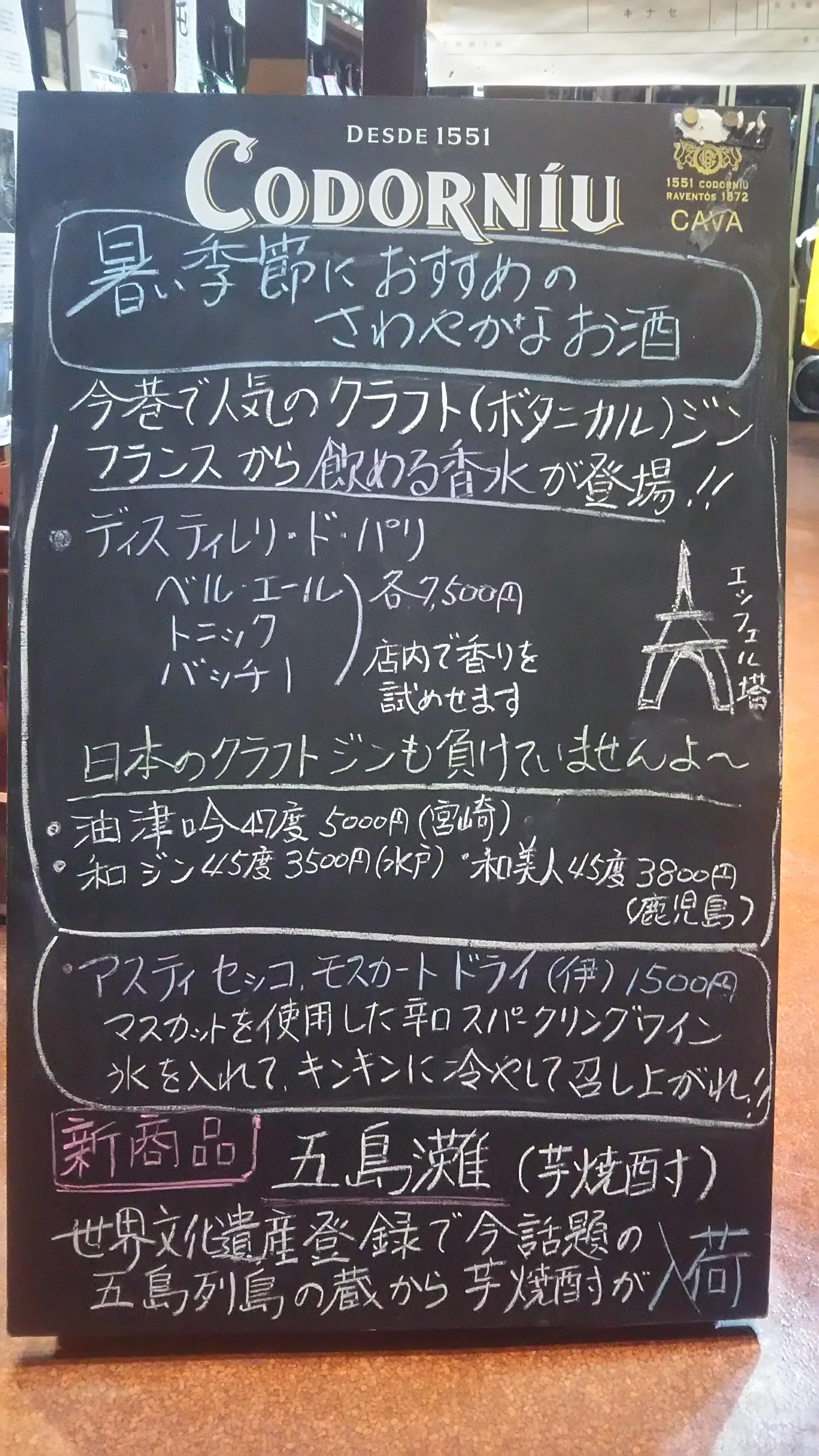 そんな訳で、昨晩のはしゃぎ過ぎで重い体を引きずりながら、今朝は昨晩の写真の整理を行っています。『壱岐焼酎を楽しむ会』の報告はもうしばらくお待ちいただくとして(笑)、今日は、店内の展示を新しく変えたのに合わせて、書き直した『店頭黒板』をご紹介したいと思います!テーマは『暑い季節にお勧めのさわやかなお酒!』と題して、本格的な夏に向けてぜひ!皆様に試していただきたい商品を中心にご紹介しています。