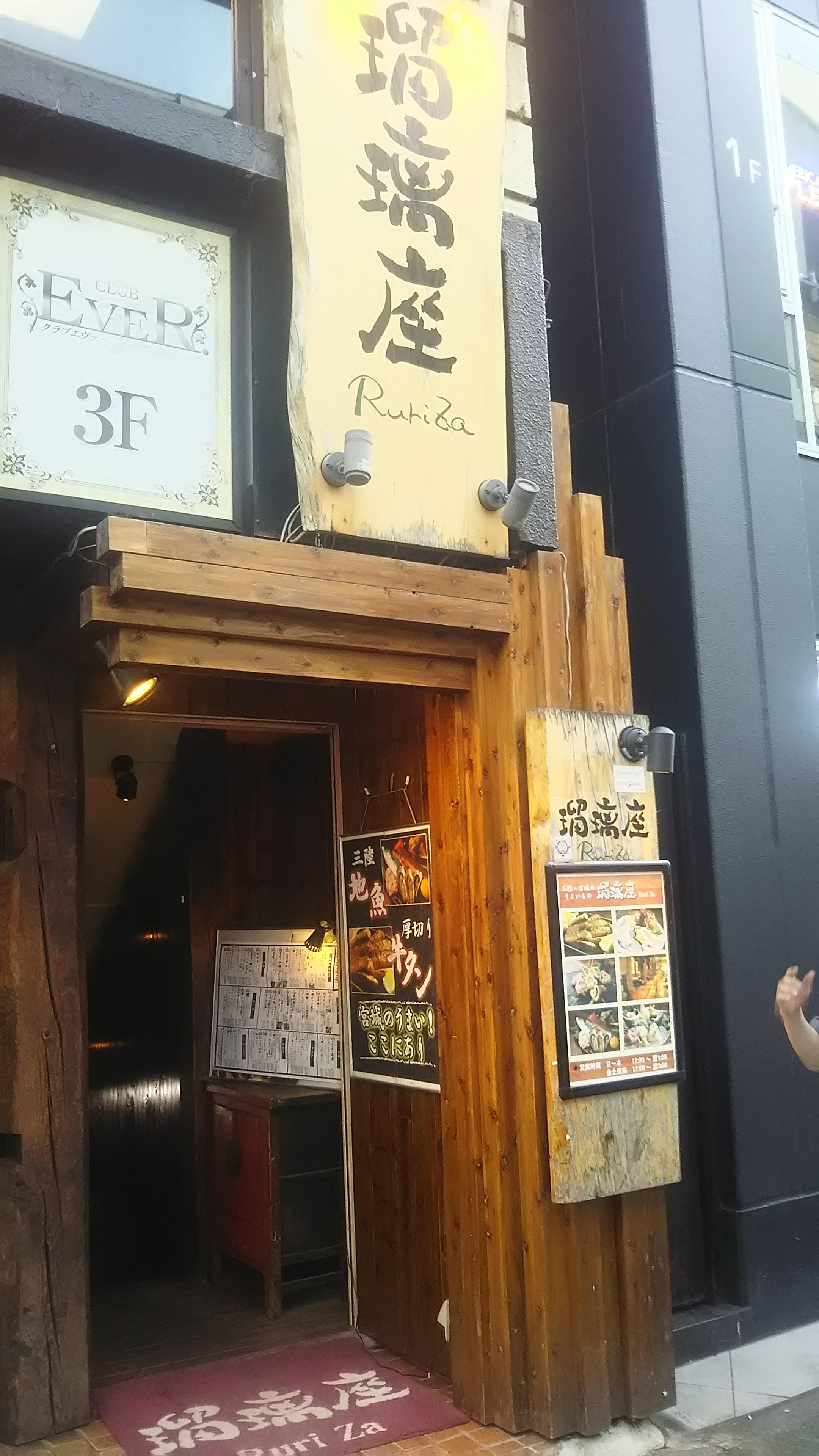 目的のお店、『瑠璃座』さんは、宮城のうまいものを中心とした地元で人気のお店だそうです。階段を下りた地下にあるお店には、入り口で靴を脱いでから入店します。開店間もないのに、すでに店内は満席状態!先ずは生ビールで乾杯し、お通しの握り寿司をつまみながら、おすすめメニューにじっくりと目を通します!