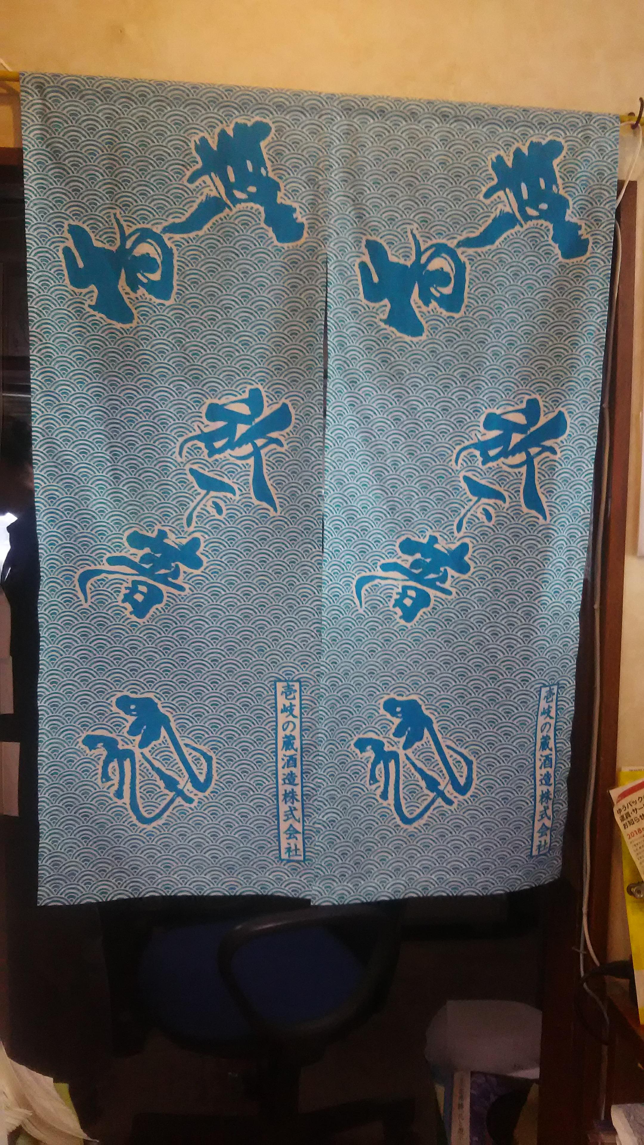 『粋なのれん』というのは、壱岐の蔵酒造さんの手拭いを二枚使って、作ったオリジナルの暖簾の事で、『壱岐(いき)』と『粋(いき)』の語呂合わせで勝手にそう呼んでいます(笑)。さっそく、店内に飾った所、お客様からの評判も上々で、これもひとえに縫製担当の『ぬーぴぃ先生』のお陰と感謝しています。