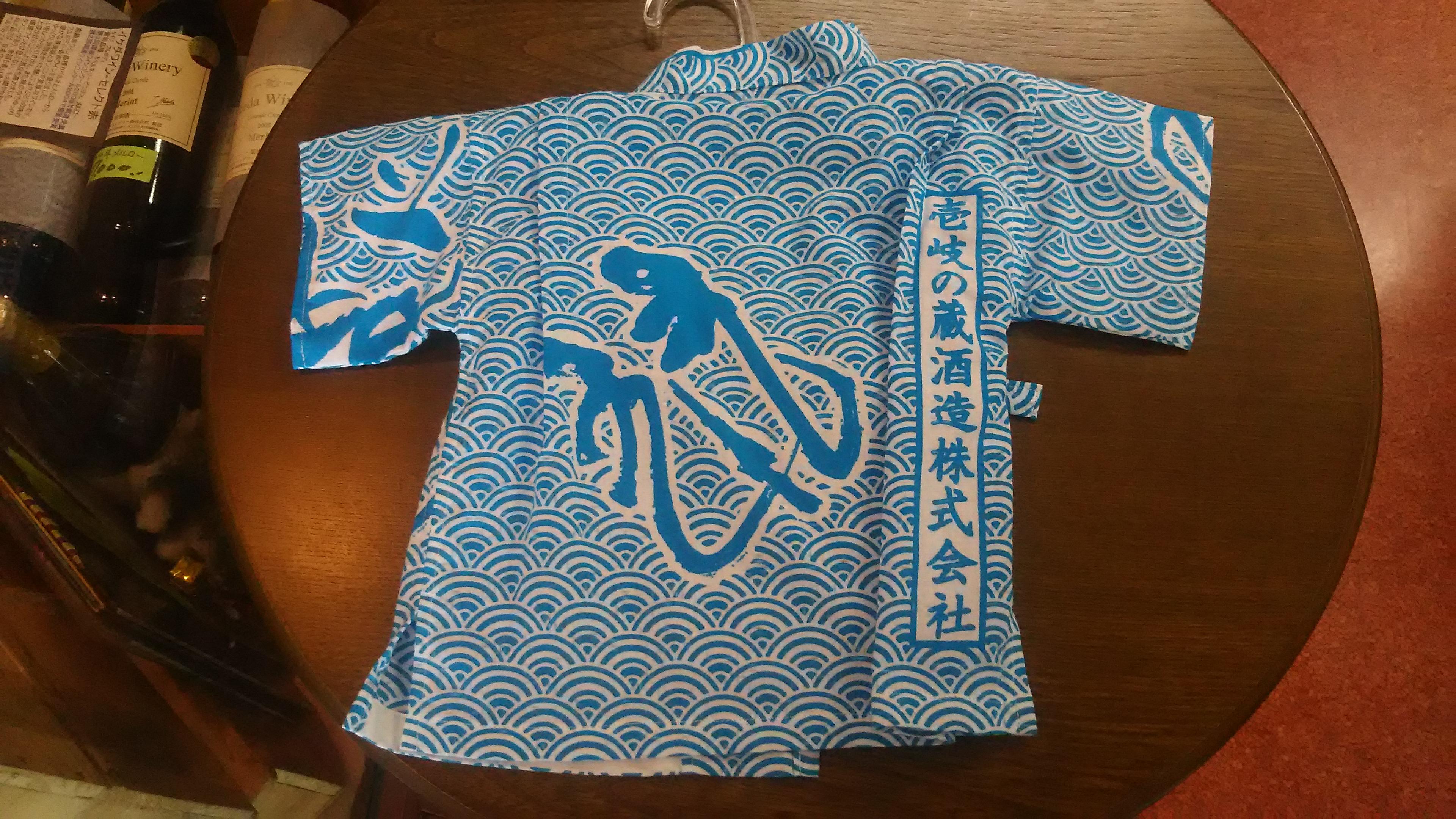 今回苦心された点は、手拭いの波模様と焼酎の銘柄のバランスだそうです。また、サイズが70と赤ちゃん用なので、すぐに大きくなって着られなくなるのは寂しいので、『肩上げ』がしてあり、この『肩上げ』を解くと、サイズが少し大きくなって長く着ることができるように配慮がしてあります。この『甚平』はすでに行き先が決まっていますが、あまりにも可愛らしいので、少しの間店内に飾っておくことにしました。