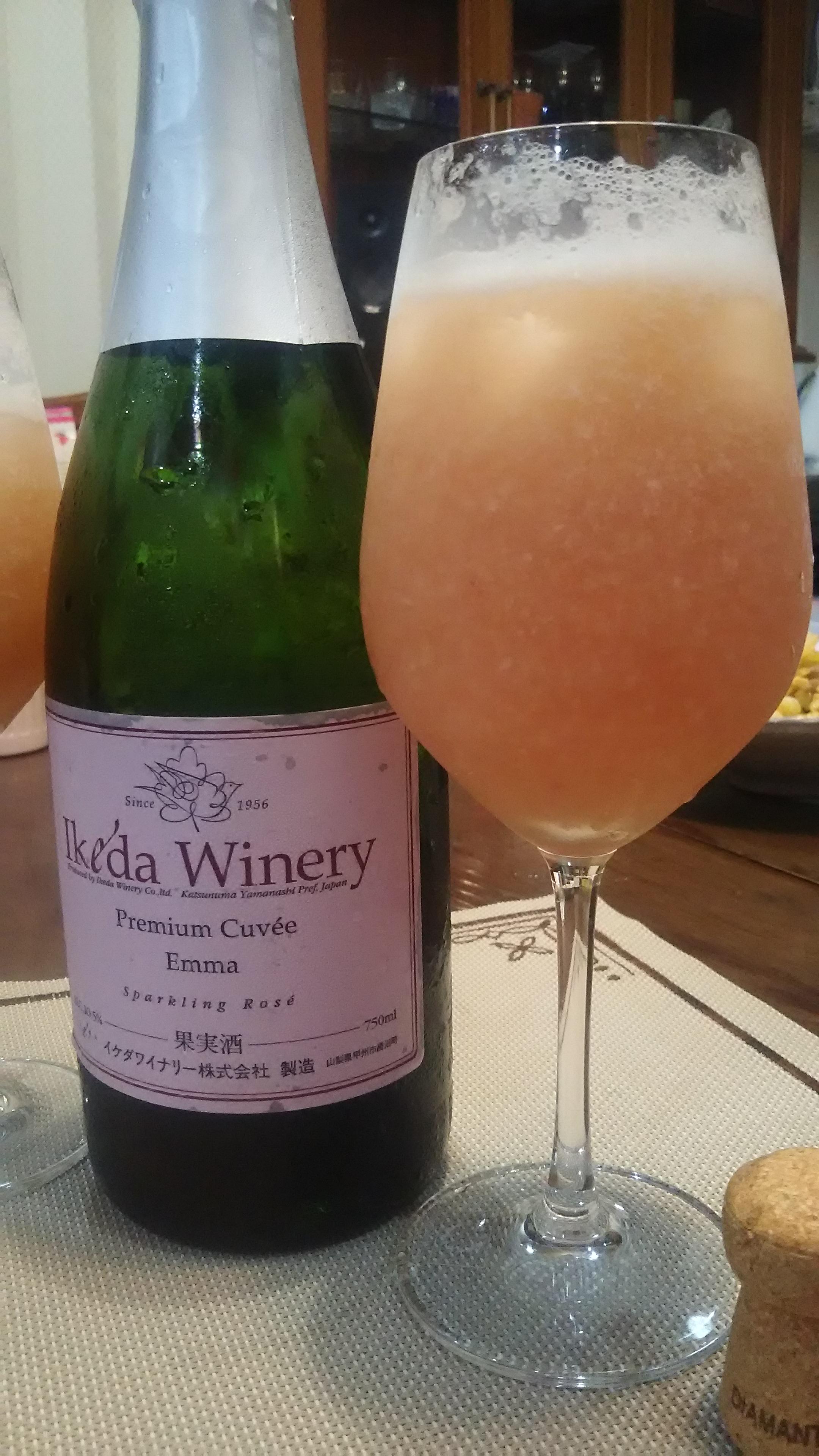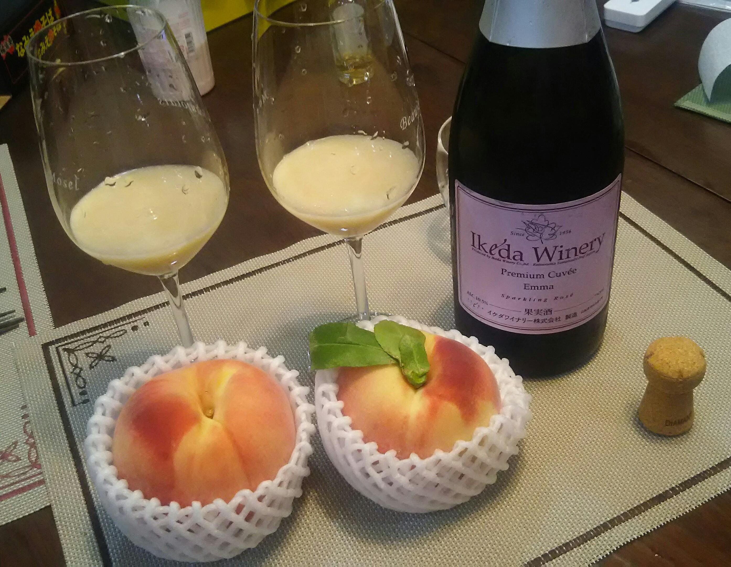 通常は、イタリアの辛口スパークリングワインと白桃のピュレとガムシロップで作りますが、今回は、桃が山梨県勝沼産なので、勝沼のイケダワイナリーさんのスパークリングワインを使うことにしました。題して『ベリーニ・イケダバージョン』です(笑)材料は、やや甘口のスパークリング・ロゼワイン『イケダ・プレミアムキュヴェ・エマ』と新鮮な白桃のみです!