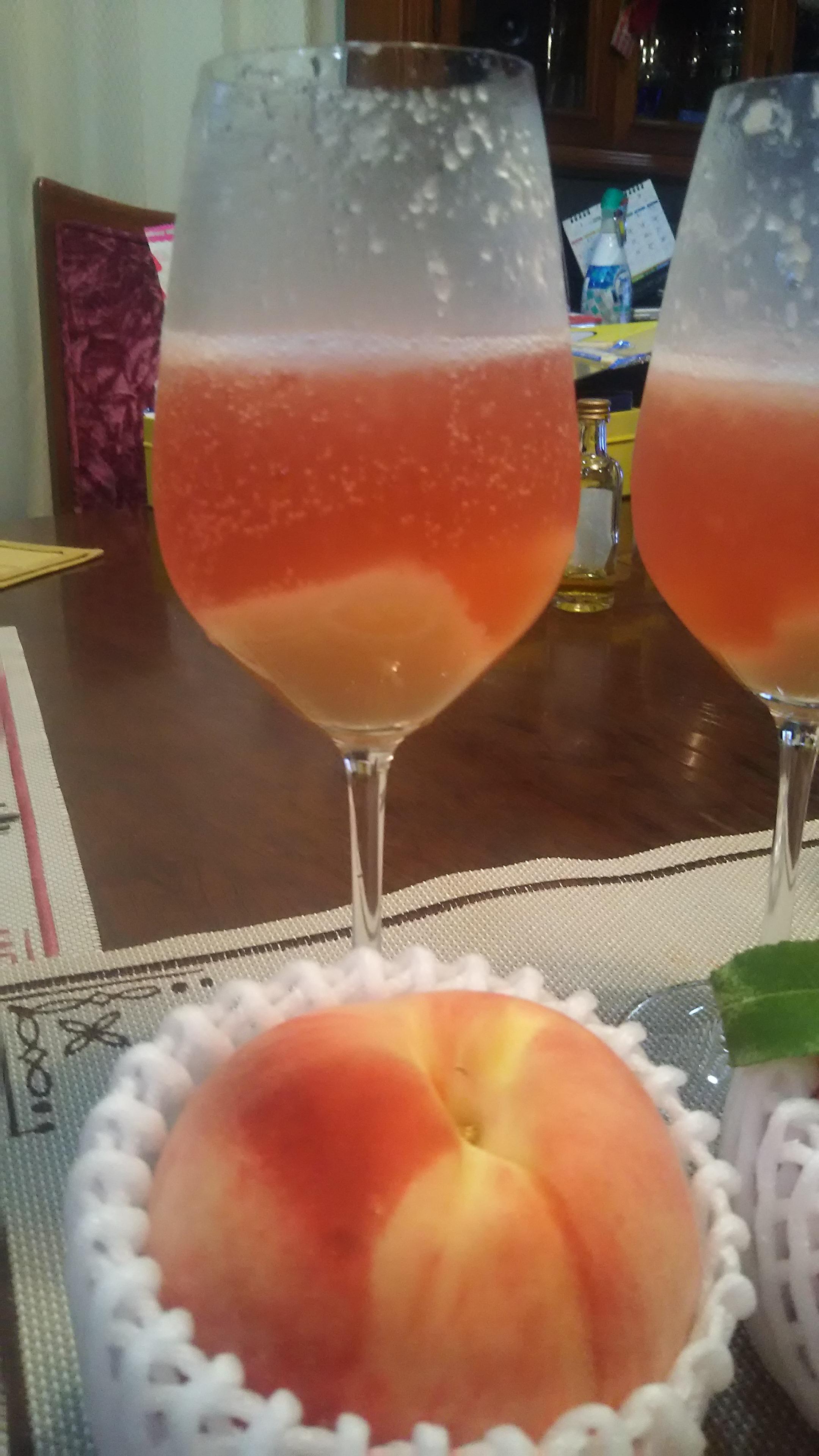 早速、桃をミキサーにかけてピュレを作り、一般的なレシピである、桃果汁ピュレとスパークリングワインを1:3の割合で作ってみました。鮮度の良い桃の果汁感を生かすために、あえてシロップを加えませんでしたが、桃の甘みが弱く、微妙な味わいになってしまいました。