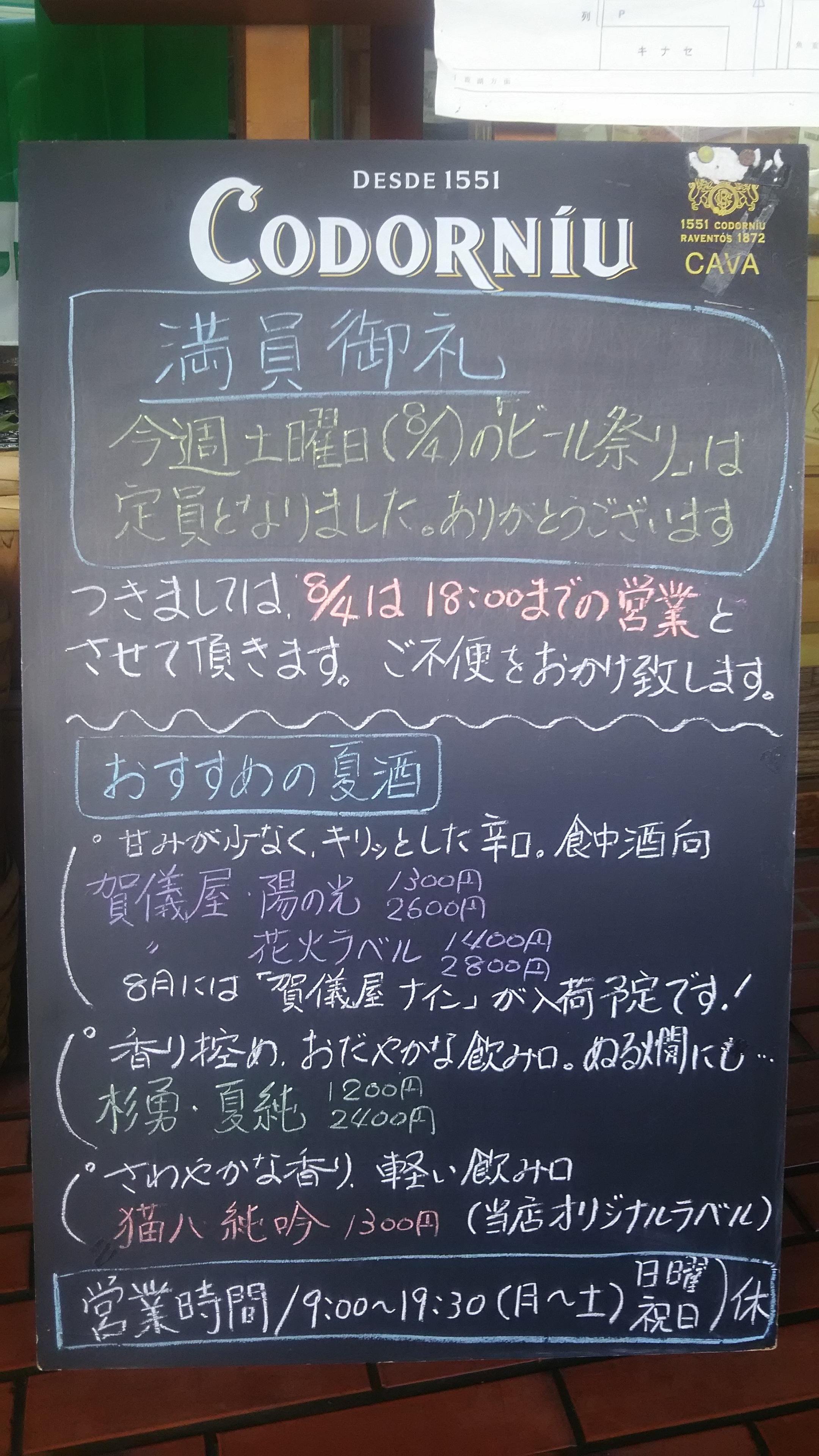 最後になりましたが、4日(土)は、18時から店内でビール祭りを行うため、営業は18時までとさせていただきます。ご来店のお客様には、ご不便をお掛け致しますが、ご理解のほど、よろしくお願いいたします。