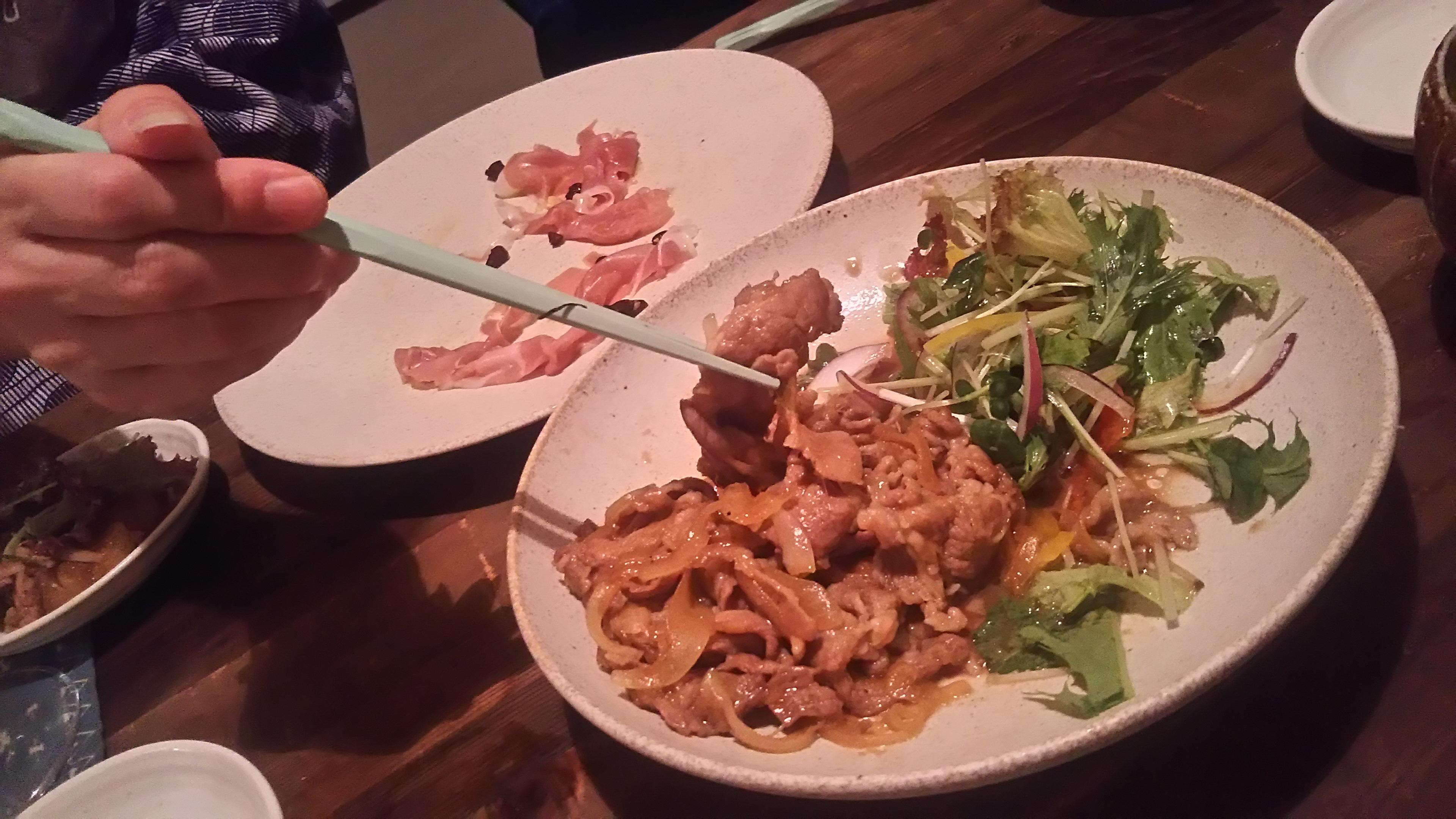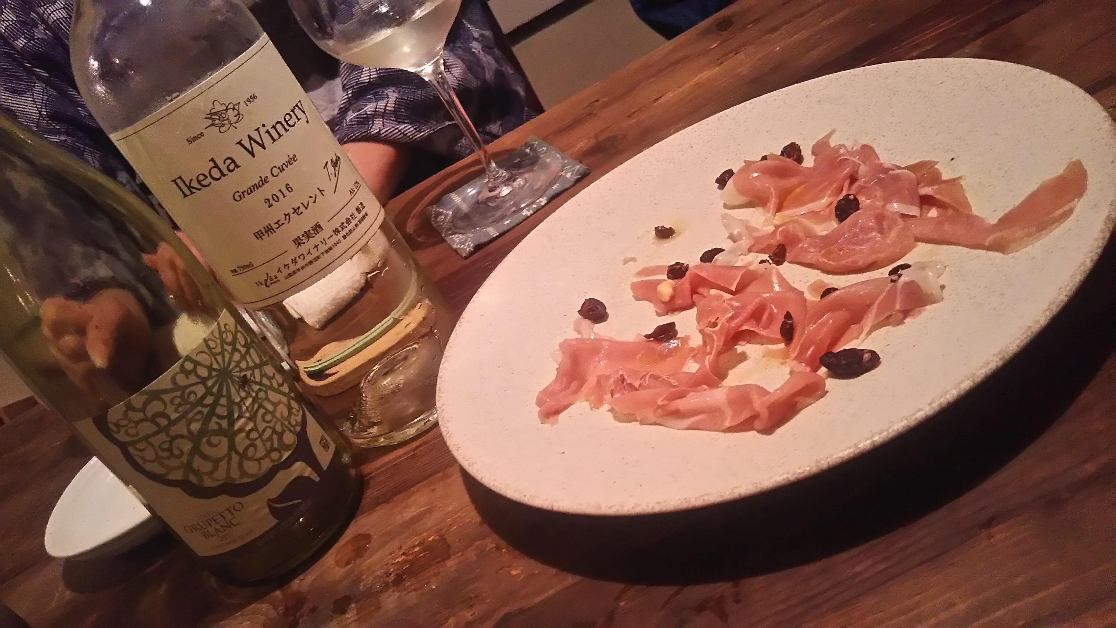 二本目に選んだ白ワインは『イケダ・甲州エクセレント』上品な甘みと芳醇な旨味を持つこのワインに合わせて生ハムの盛り合わせを注文しました。生ハムの塩っ気とワインの甘さがよく合い、抜群の美味しさです。そして、お肉料理第二弾は茨城の銘柄豚『美明豚』を使った豚の生姜焼きです。濃厚な甘辛タレの豚肉は白飯が欲しくなりますが、付け合わせの野菜と共に頬張り、ワインを一口。こちらも白飯に負けないくらい最高の組み合わせでした(笑)。