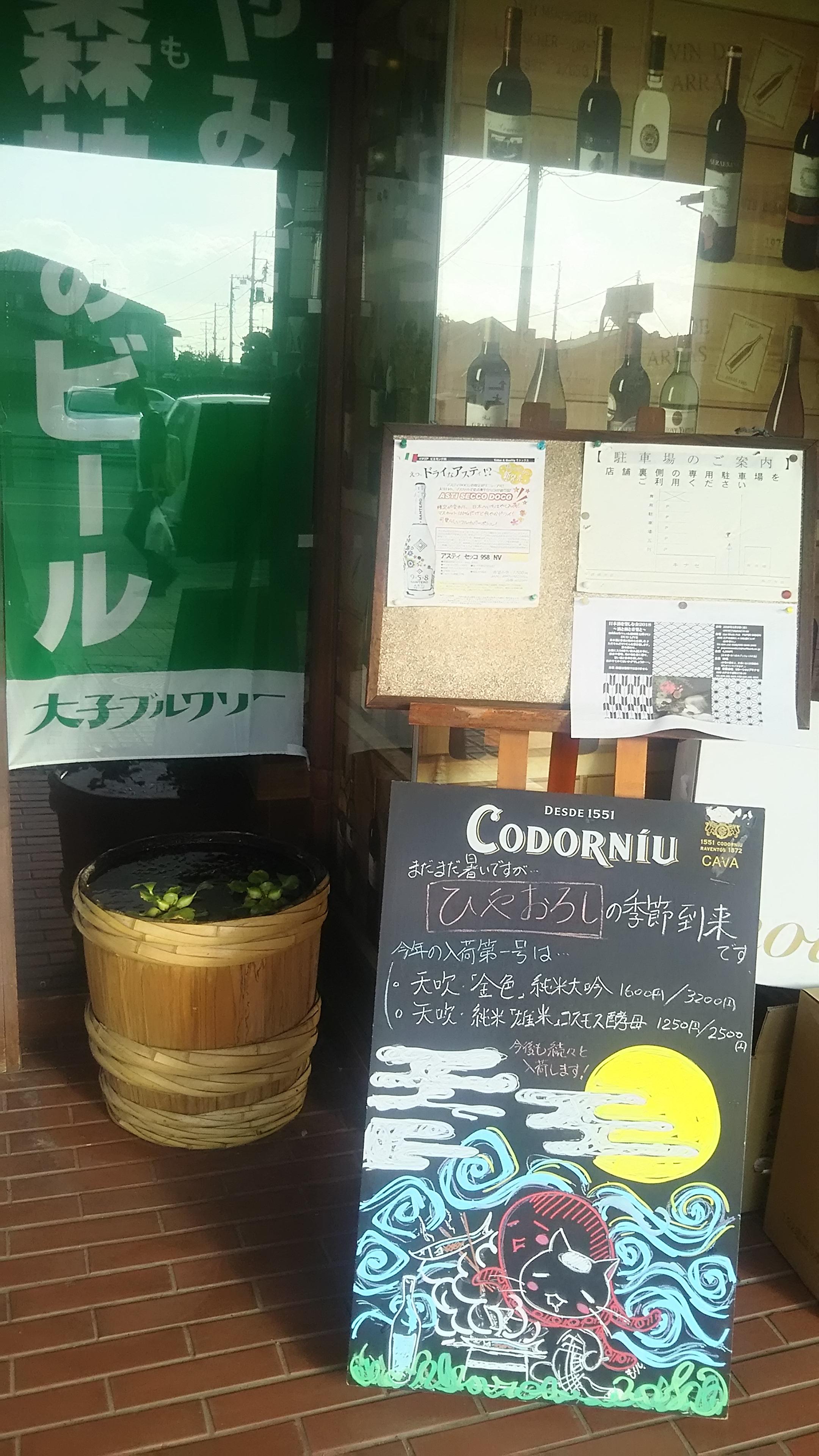 先日、もりしまさんに描いていただいた黒板がいよいよ日の目を見る時がやってきました。今年の当店の『ひやおろし』一番乗りは、九州は佐賀県の『天吹酒造』さんです。