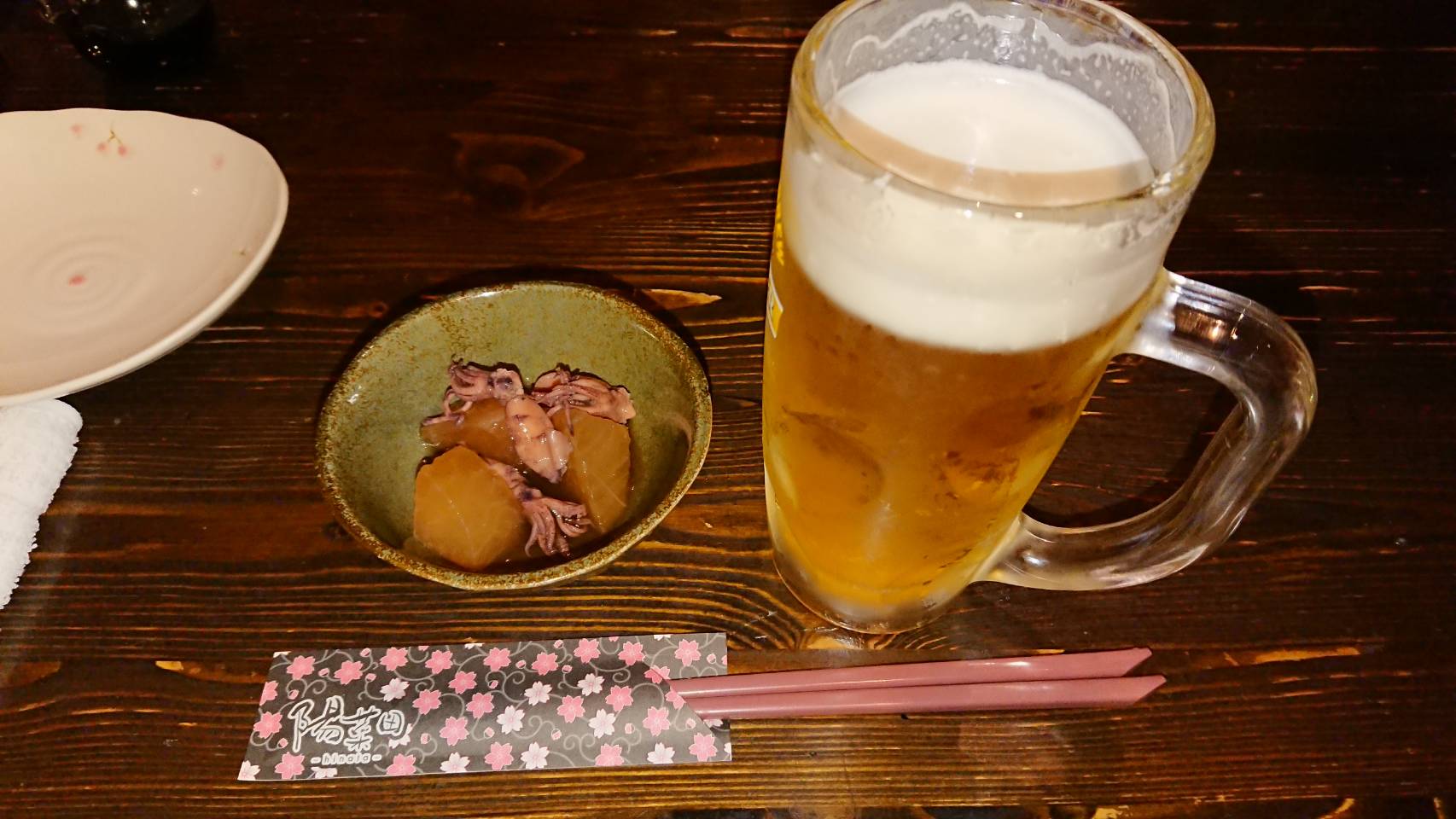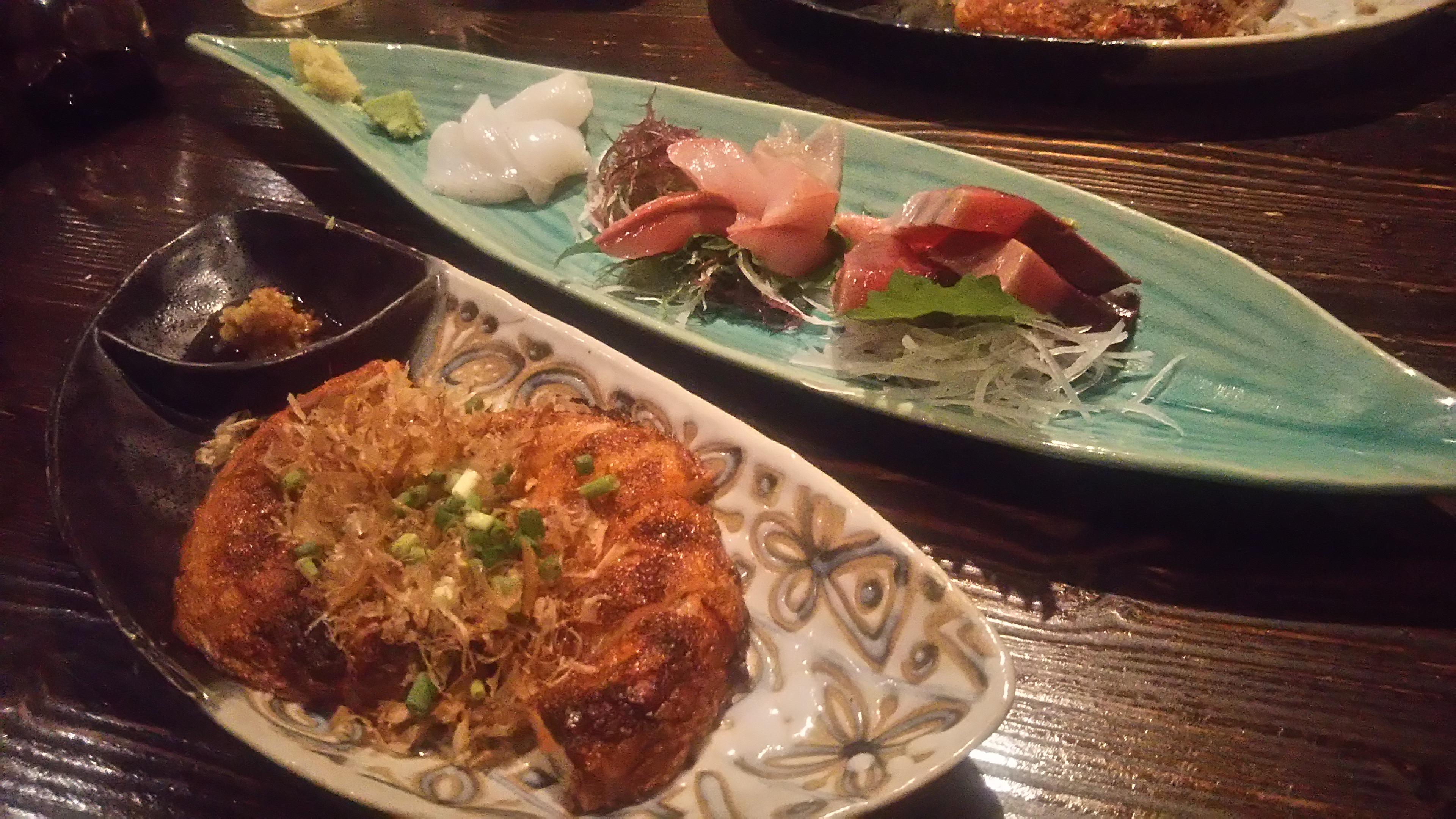 この日も蒸し暑かったので、先ずは生ビールで乾杯し、九州からの長旅をねぎらいました。お通しのイカ大根の煮つけを摘まみながら、旬のお勧めが書かれた黒板に目を通します。お刺身の盛り合わせは、今が旬のカツオ、タコ、シーラの三点盛り。さつま揚げは表面カリカリ、中はフワフワで絶品です。