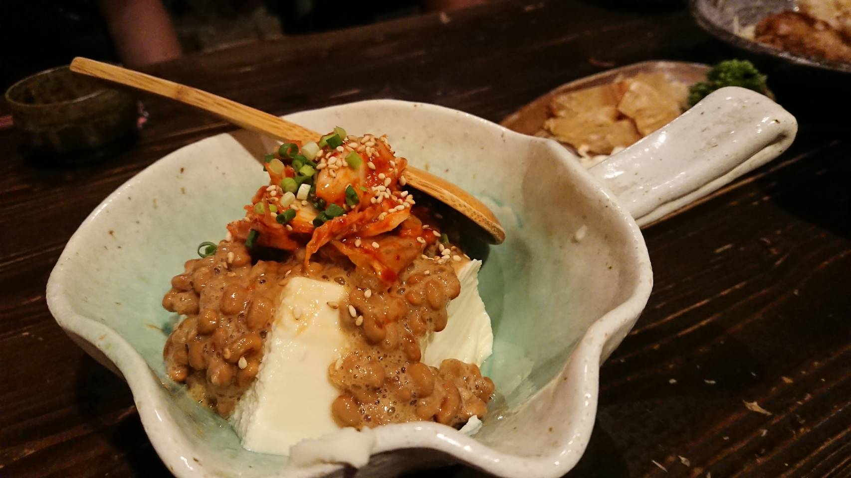 せっかく水戸に来たのだからと、『納豆料理』を注文することにしました。水戸に住んでいても、納豆を使った料理は滅多に食べないので、これも良い機会です(笑)『水戸やっこ』は冷奴の上に納豆とキムチがトッピングされ、これを混ぜて頂きます。『納豆メンチ』はひき肉がたっぷりと詰まっています。そして、定番の『納豆オムレツ』には、佐藤さんも美味しい~!を連発していました(笑)
