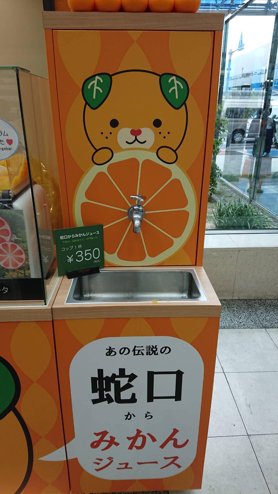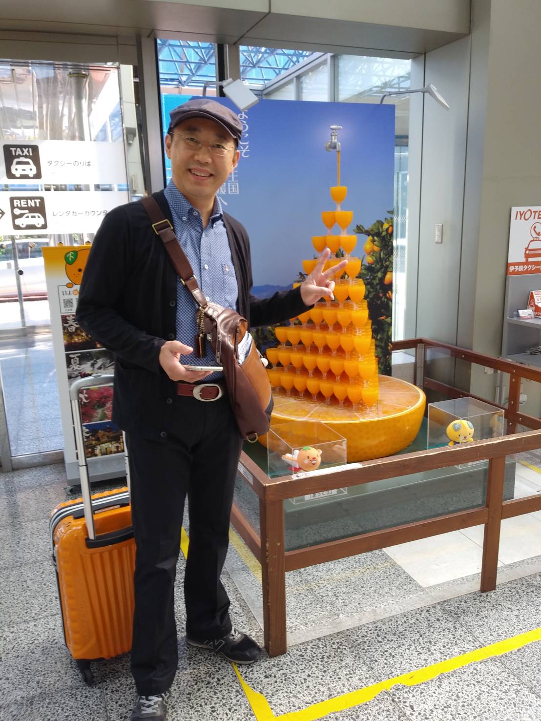 夜明け前の午前3時に水戸を車で出発し、羽田空港から一路、愛媛県の松山空港には9時前に無事到着。そこでまず初めに出迎えてくれたのが、愛媛県のゆるキャラ『みきゃん』とミカンジュース・タワーでした。そして、『愛媛県の水道の蛇口からミカンジュースが出てくる』というあの都市伝説を再現したものまでありました(笑)地元の方曰く、実際には、そんなことはなく、本当の都市伝説だそうです!