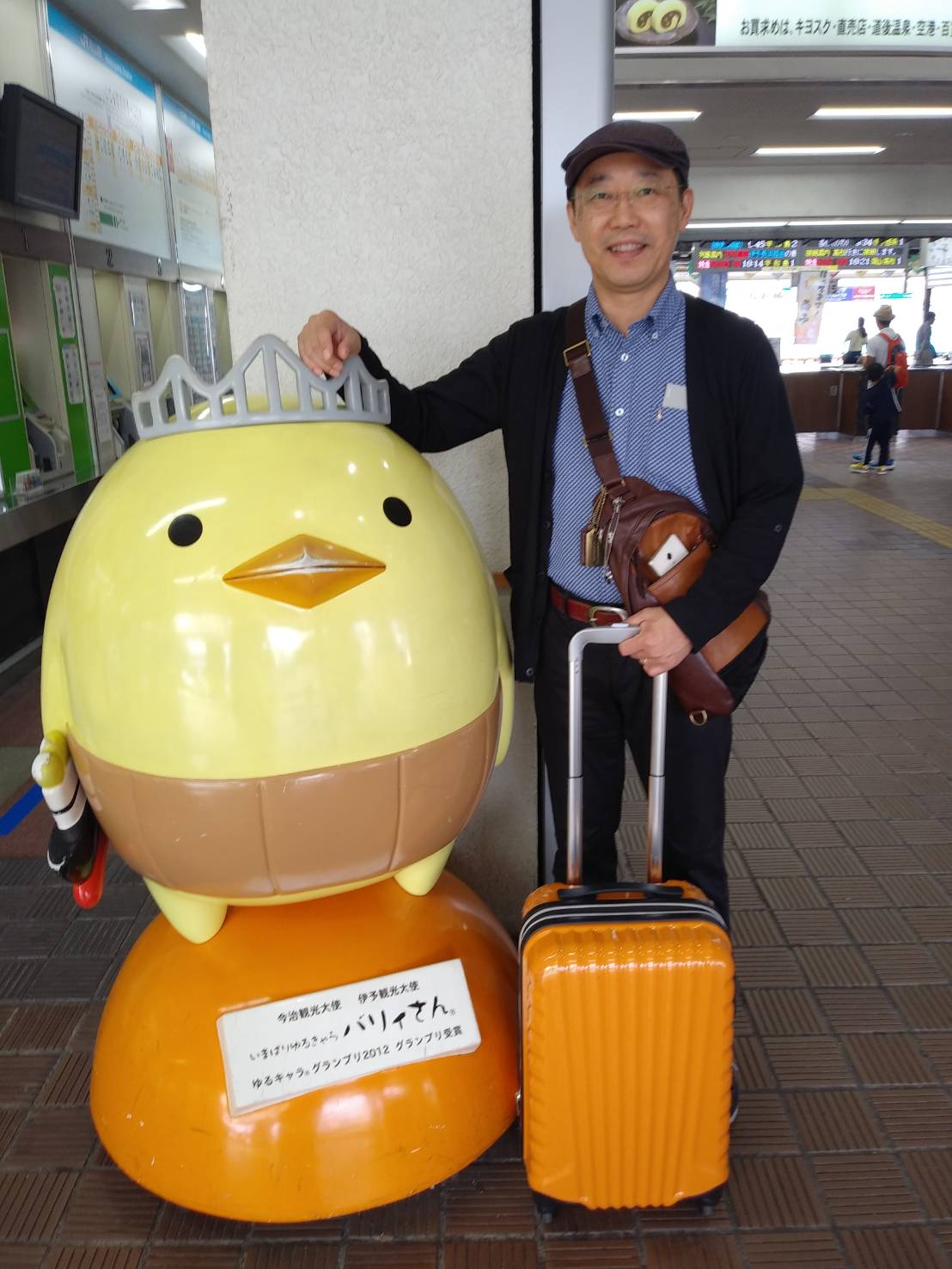 その後、松山駅までバスで移動。所要時間は約10分、余りにも近くてびっくり!アクセスの良さはピカイチですね~。そして、松山駅では今治市のゆるキャラ『バリーさん』が出迎えてくれ、記念写真を一枚!観光客気分全開です(笑)駅の改札脇に、とっても美味しそうなうどん屋さんと名物のじゃこ天屋さんがあったのですが、この日はお昼ご飯を蔵元様と食べる約束をしていたので、後ろ髪を引かれる思いで次なる目的地へ向けて電車に飛び乗りました。
