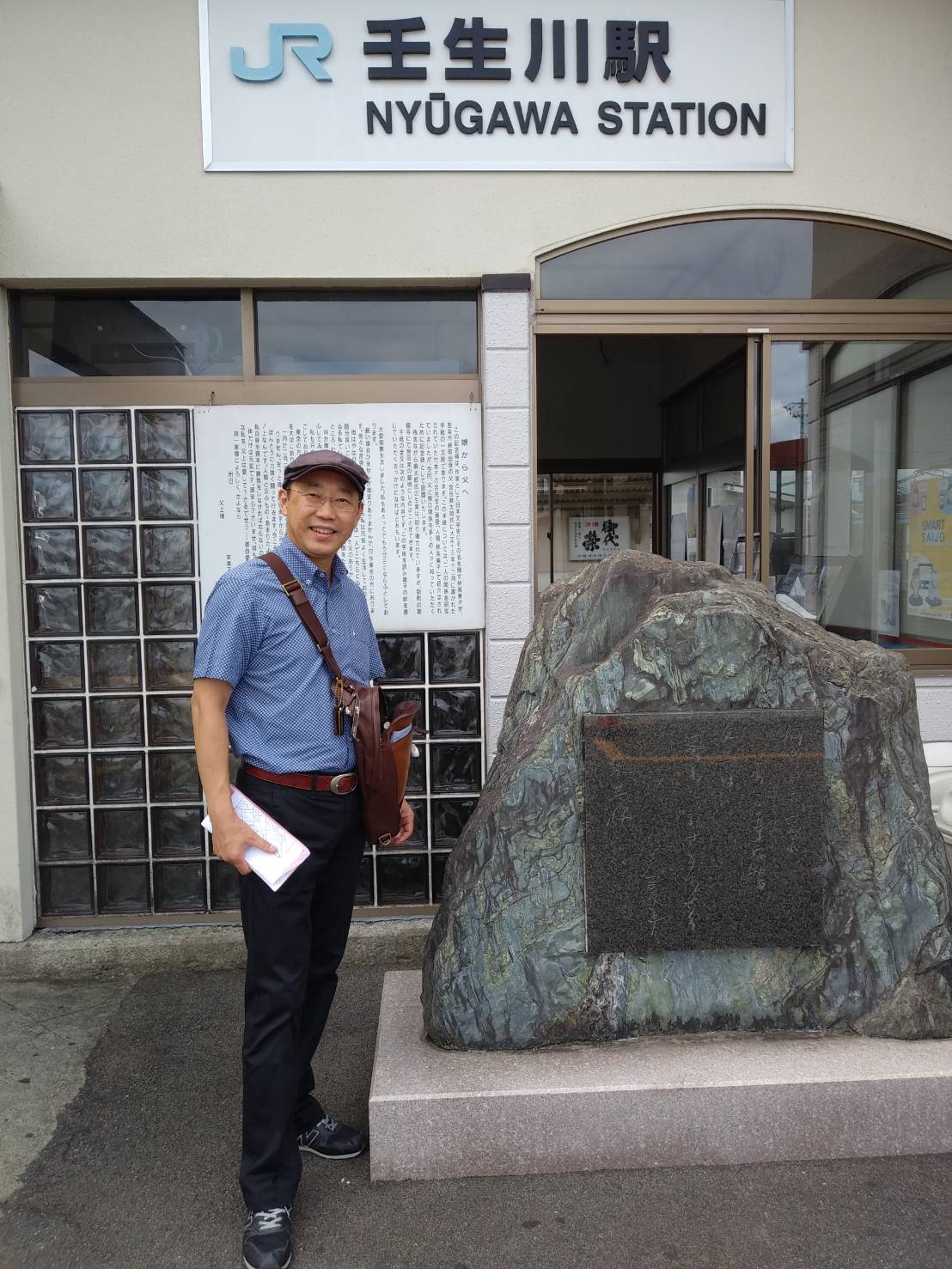 車窓から瀬戸内海の美しい海や点在する島々を眺めながら特急電車に揺られること約1時間、今回の目的地『壬生川駅』に降り立ちました!ちなみに、この駅名は『にゅうがわ』と言い、『みぶがわ』ではありません。そして、何故か駅の公衆トイレの壁には、大きな『カブトガニ』のオブジェが張り付いていてビックリ!駅前から長閑な町並みを散策しながら待ち合わせとなっている本日の宿まで徒歩でぶらりと15分間。途中の田んぼには刈り入れ間近の稲がたわわに実っていて、水の中に大きなタニシや沢山のトンボが飛び交っていました。こうして水戸を出発してから約9時間、今回の目的地に無事たどり着きました!