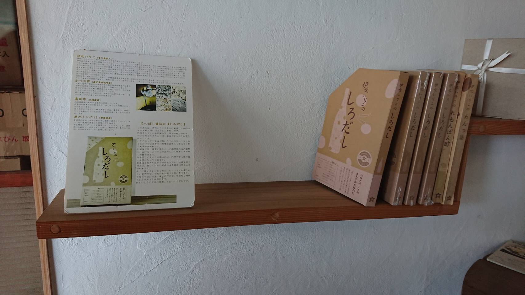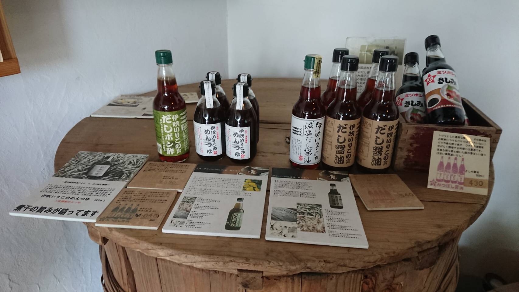 木樽を利用した陳列台には、当店でも人気の『めんつゆ』が並び、その中でも一際目についたのが、『ブックスタイルのパッケージ』に入った商品です!しろだし、れもんぽん酢、めんつゆと色々な商品があり、その使い方が紹介されたレシピ付きのパッケージは、初めて使う方にも分かりやすく、メール便として送ることもでき、ちょっとしたプレゼントに大好評だそうです。見た目もお洒落なので、今後、当店でも扱いたいと思っています(笑)