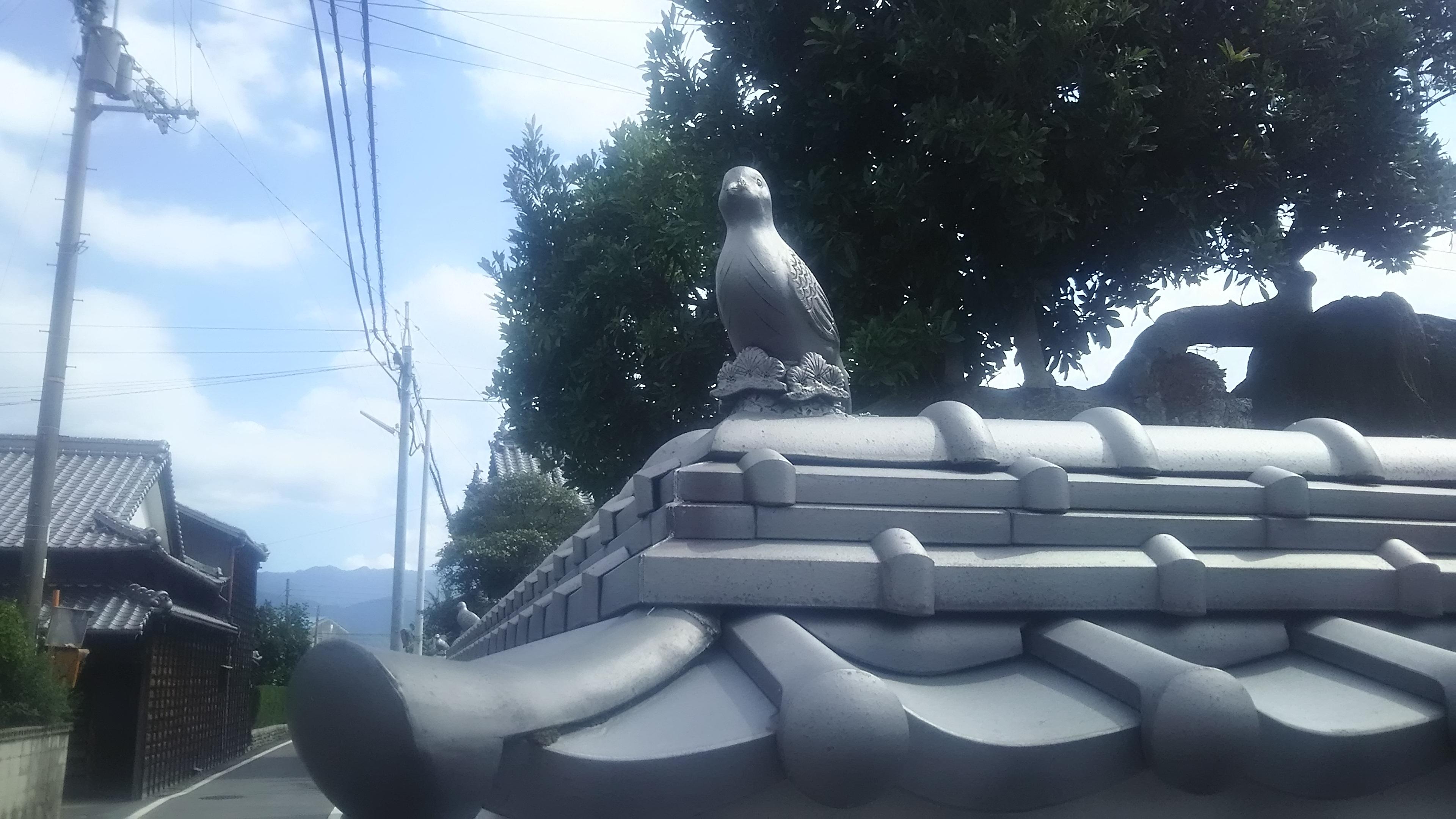 ここで、みどりさんが気になっていた『屋根瓦に付いた、とげとげとしたもの』をご紹介したいと思います。それは、焼き物で出来ている『シャチホコ』や『龍』などの飾り物で、瓦屋根の隅々にのっています。蔵元の塀の上にもおじいさんが好きだった『ハトの飾り物』が何体も乗っていました。お隣の今治市はタオルだけでなく瓦の生産地としても有名で、一時期、様々な飾り物を屋根や塀の上に飾るのが流行したことがあったんだそうです。中には、お城のような立派な飾り物が付いているお宅もありました!