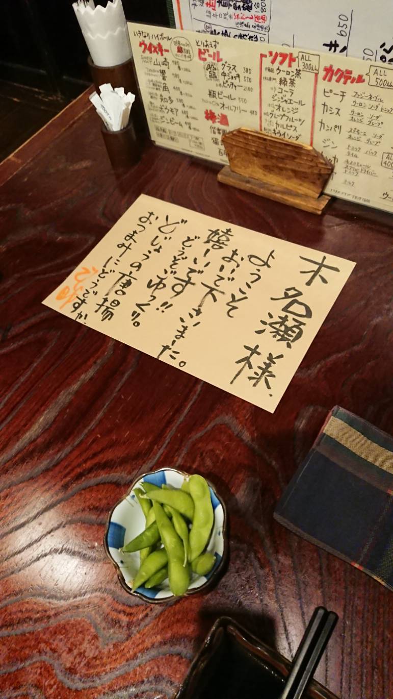 私たちは、古民家風の板の間のテーブル席に通されました。事前に予約をして行ったのですが、テーブル上には『ウエルカムメッセージ』が置かれていました。粋な心使いに嬉しくなってしまいました(笑)早速、メッセージに書いてあったお勧めの『どじょうの唐揚げ』と、鮮度が良くないと食べることのできない『秋刀魚の刺身』を注文しました。乾杯は、甲州ワインの辛口白で。キリリと冷えた白ワインの上品な酸味と料理がベストマッチングです!