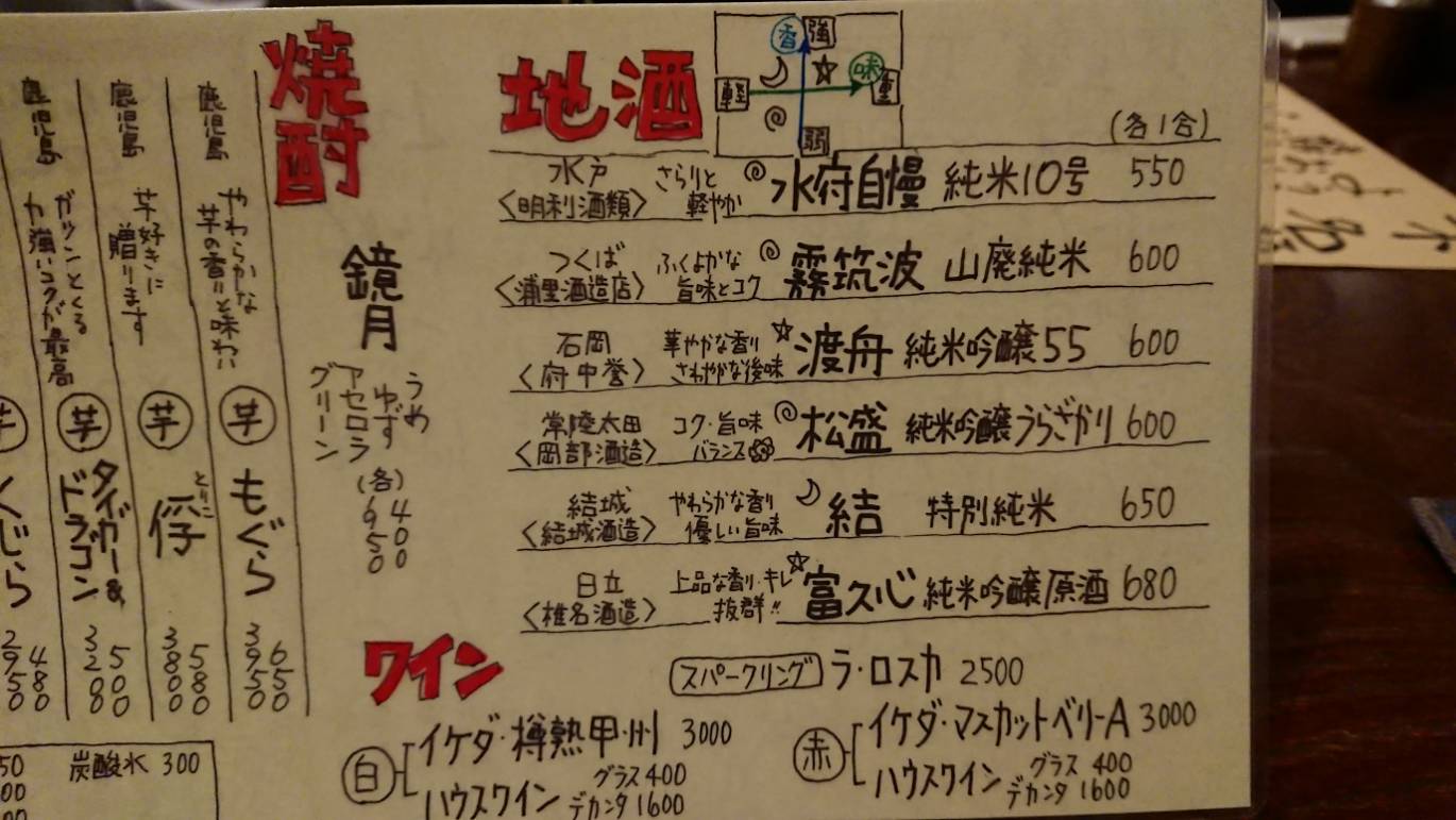 豊富な料理のメニューにばかり気がいってしまいがちになりますが、お酒のラインナップも本格的です!地元、茨城県の地酒が豊富に揃っていて、しかも、正一合でこの値段は良心的です。品質管理も良く、この日も立て続けに三種類を頂いてしまいました(笑)本格焼酎も、グラスで楽しむことができるので、色々と飲んでみたい方にもお勧めですよ。