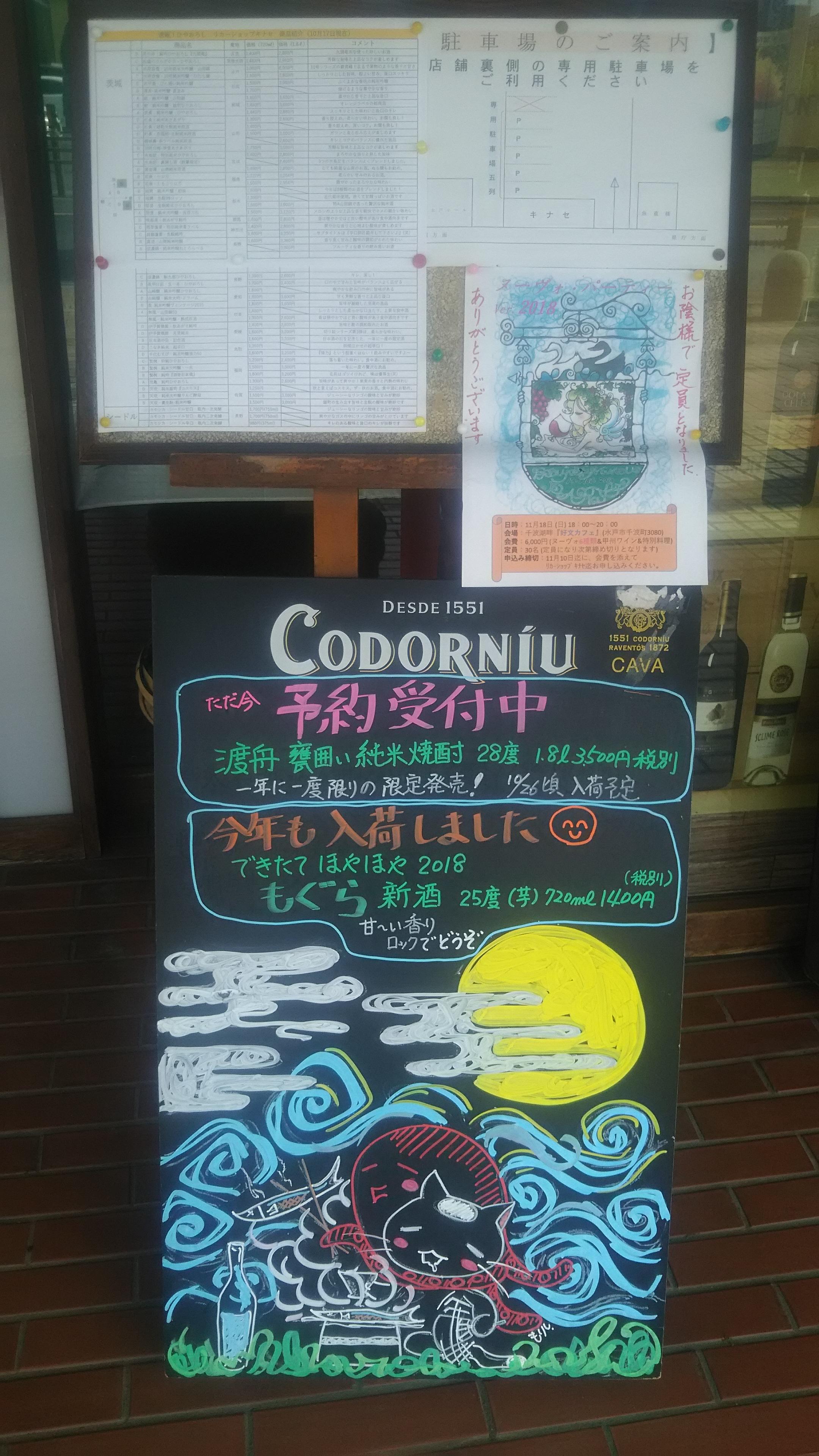 さらに、『ひやおろし』の入荷情報リストの隣には、来月開催予定となっている『ヌーヴォ・パーティ2018』のポスターを掲示させていただいています。ポスターには、『満員御礼』の表記がございますが、若干名でしたらお席のご用意ができますので、お早めにご連絡くださいますようお願いいたします。