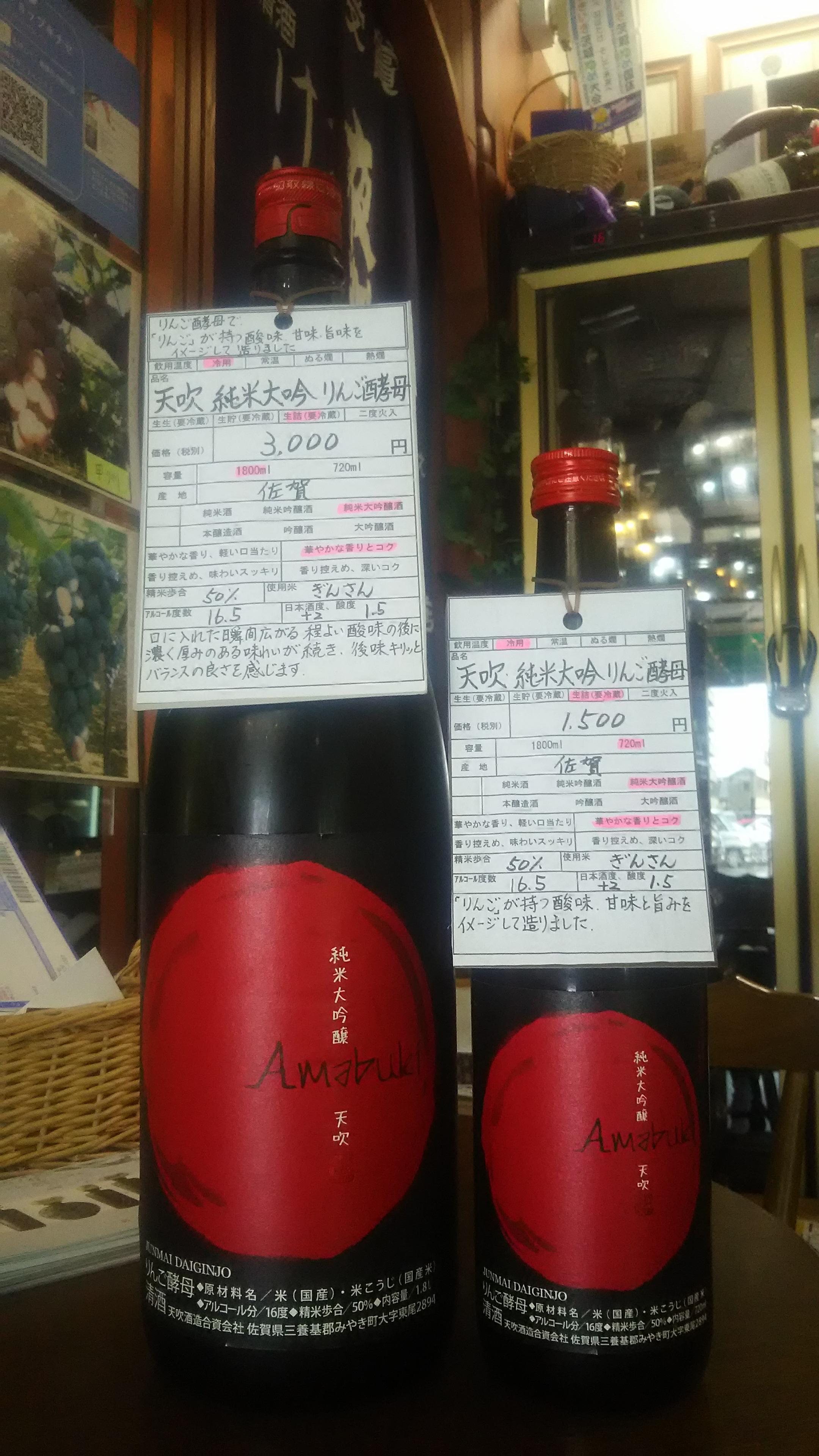 最後になりましたが、昨日、今年のひやおろしの、オオトリを飾る『天吹・純米大吟醸りんご酵母』が入荷してきました。口に入れた瞬間から広がるほど良い酸味と濃厚な旨味がバランスよくまとまった一品で、日本酒の代表的な香りでもある『リンゴの香り』が楽しめるます。