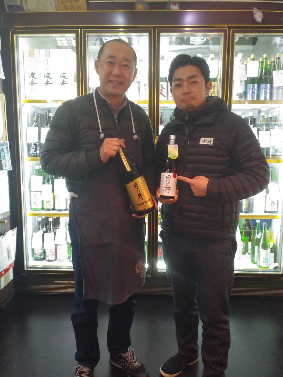 しかも今日は、お酒の入荷に合わせたかのように、『8代目蔵元の坂本直彦専務』がお越しになりました!せっかくの機会なので、入荷したばかりの『月の井・純米無濾過生原酒』と今年新発売されたばかりの『月の井・純米大吟醸焼酎』と一緒に記念撮影させていただきました。