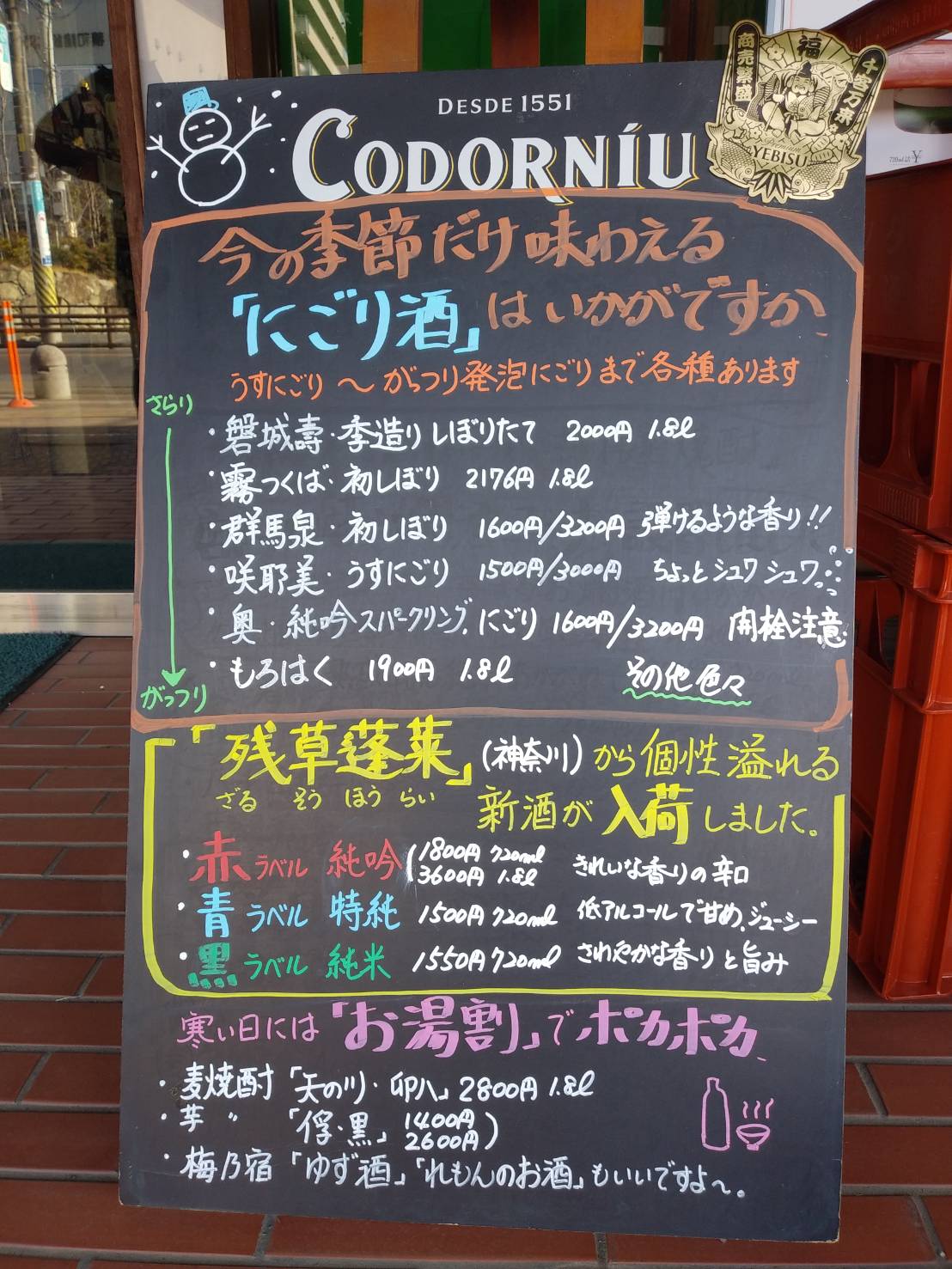 そんな苦心の末に出来上がった今回の黒板のテーマは『今の時期ならではのお酒、三部作!』です。先ず一つ目は『今の季節だけ味わえるにごり酒』のご紹介です。人生いろいろ、にごり酒も色々で、一口に『にごり酒』と言っても、サッパリとしたものからコッテリとしたものまで実に様々です。そこで、サラリとしたものからコッテリとしたものまで上から順位分かりやすく並べています。