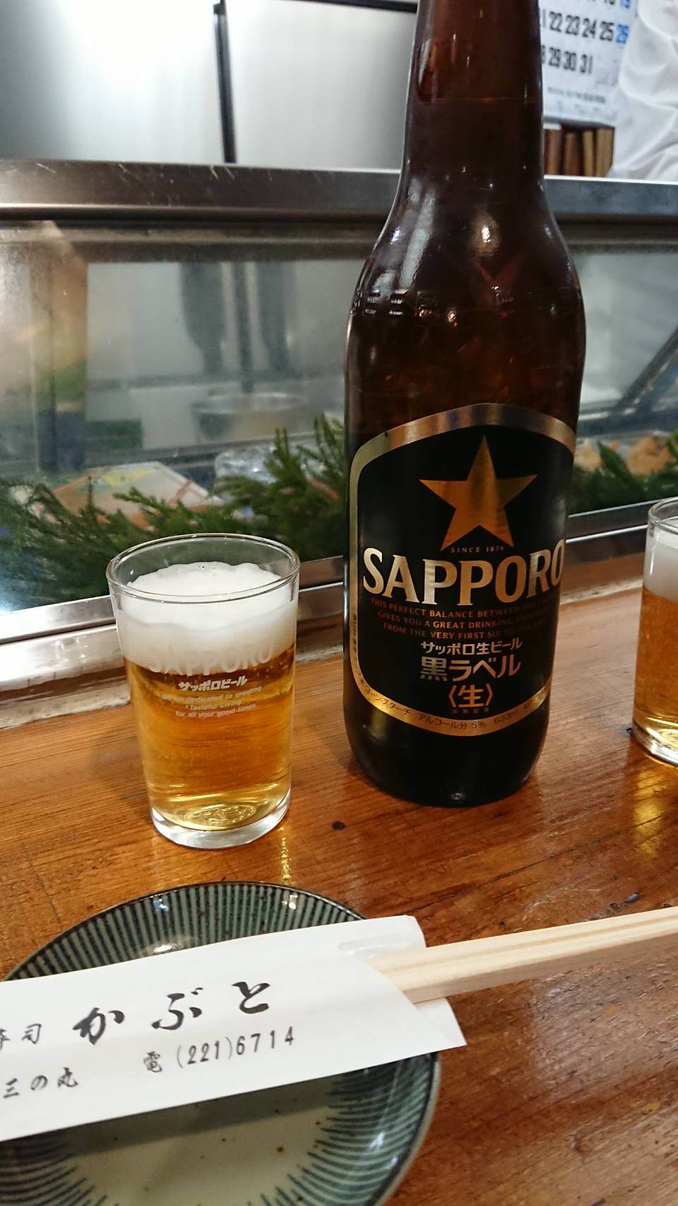 暖簾をくぐって店内に入ると、大将と二代目が笑顔で出迎えてくれました!すし屋の特等席ともいえる『L字のカンター』に陣取り、まずはビールを注文したところ、今では珍しいサッポロ黒ラベル『大瓶』が登場。続いて、今日のお勧めの一品『ブリのかぶら漬け』が・・・。濃厚なブリの脂をかぶらが優しく包み込んで、サラリとした味わいを醸し出してくれます。
