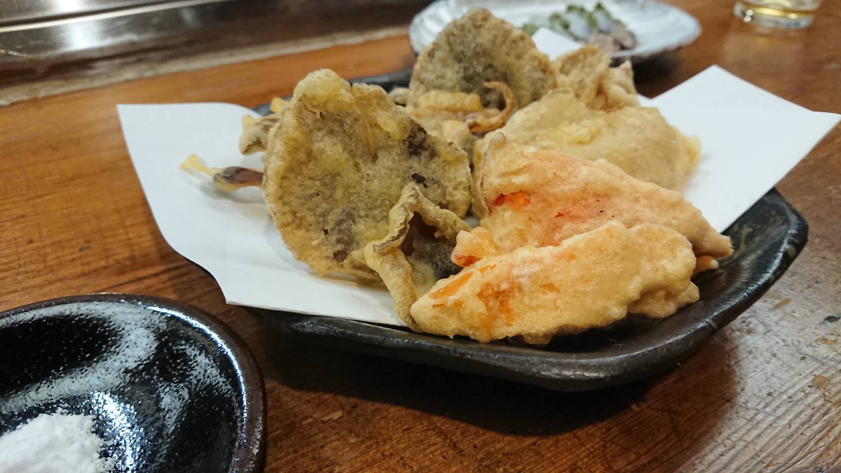 実は、かぶと寿司の大将は、キノコや山菜採りの名人だそうで、今回はとっても珍しいキノコのてんぷらを頂くことができました。天然のなめこや舞茸はもちろんの事、『かおり茸』や見た目の鮮やかな赤色が魚の鱒に似ていることから名付けられた『マスタケ』など。沖縄、波照間島のパウダーソルトでいただきました。