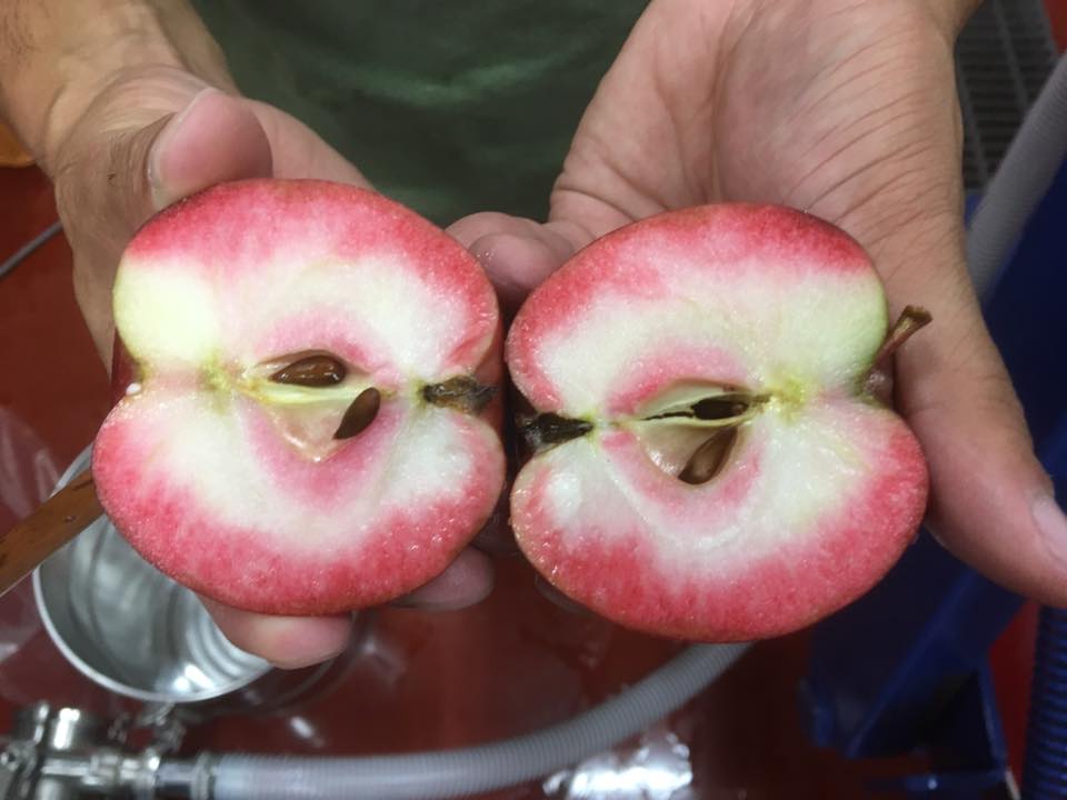 一年に一度だけ発売される『ロゼ』は、信州大学の赤果肉リンゴ『ハニールージュ』で造ったシードルです。今年は猛暑のため、赤果肉りんごの色が入りにくく、桜色のロゼになっています!
