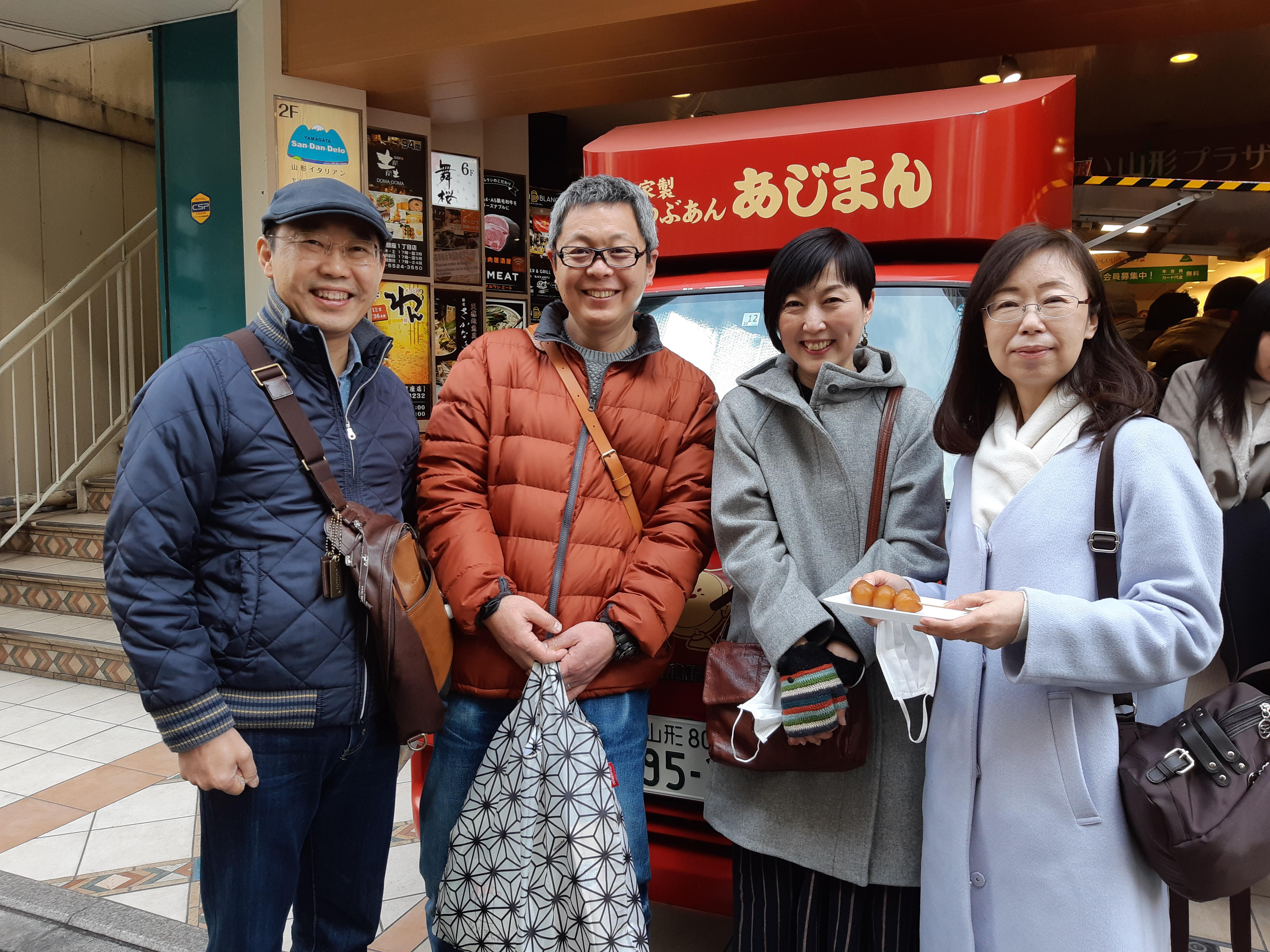 今日は、昨日に引き続きアンテナショップ巡りの後半戦についてお話ししたいと思います。丁度10軒目のアンテナショップ『おいしい山形プラザ』で、『玉コンニャク』を食べて、お土産に昔懐かしい『ミルクケーキ』を買い、店を出ようとした時、群馬県で酒屋を営む友人夫妻とばったり出くわしたんです。