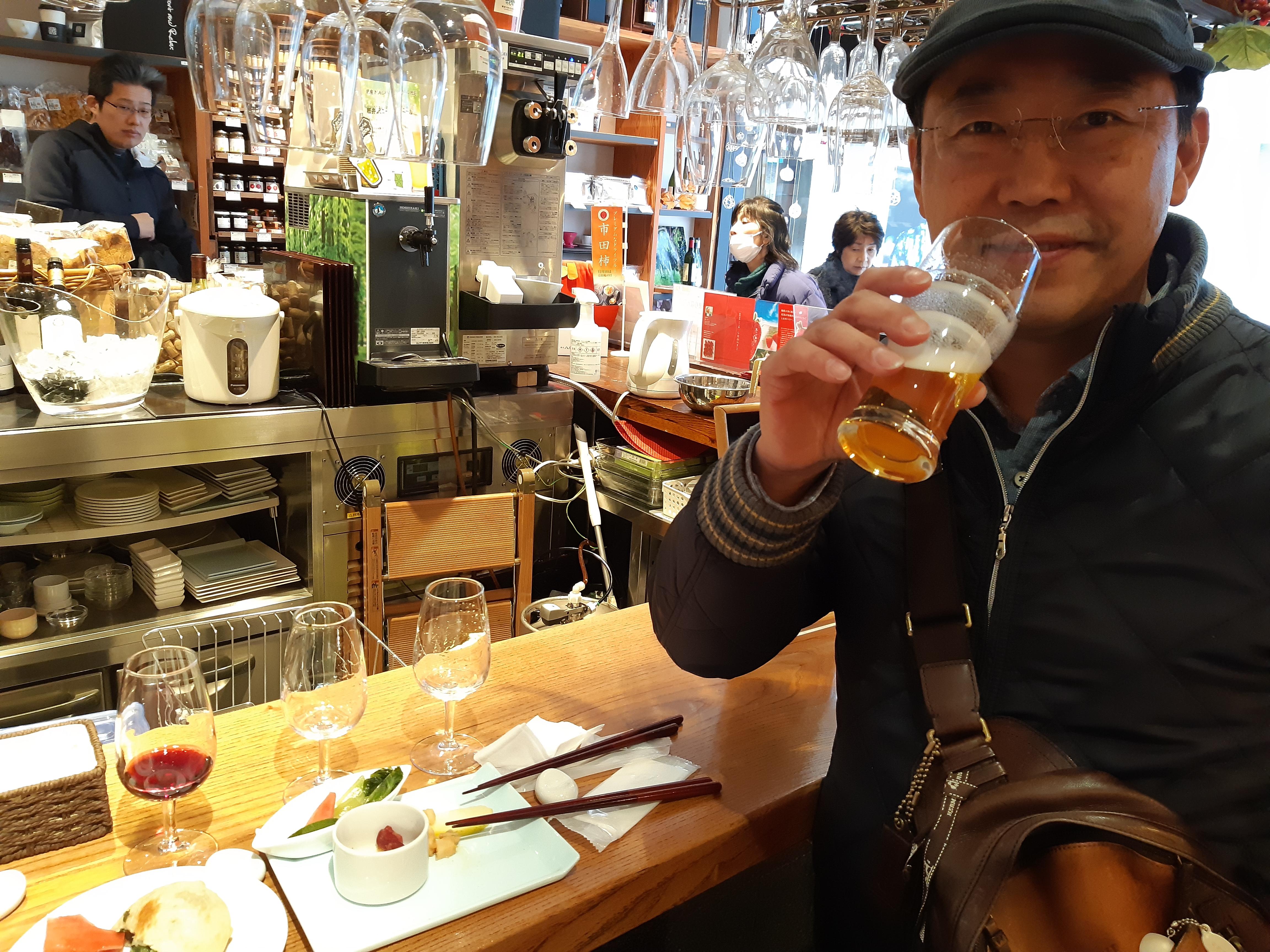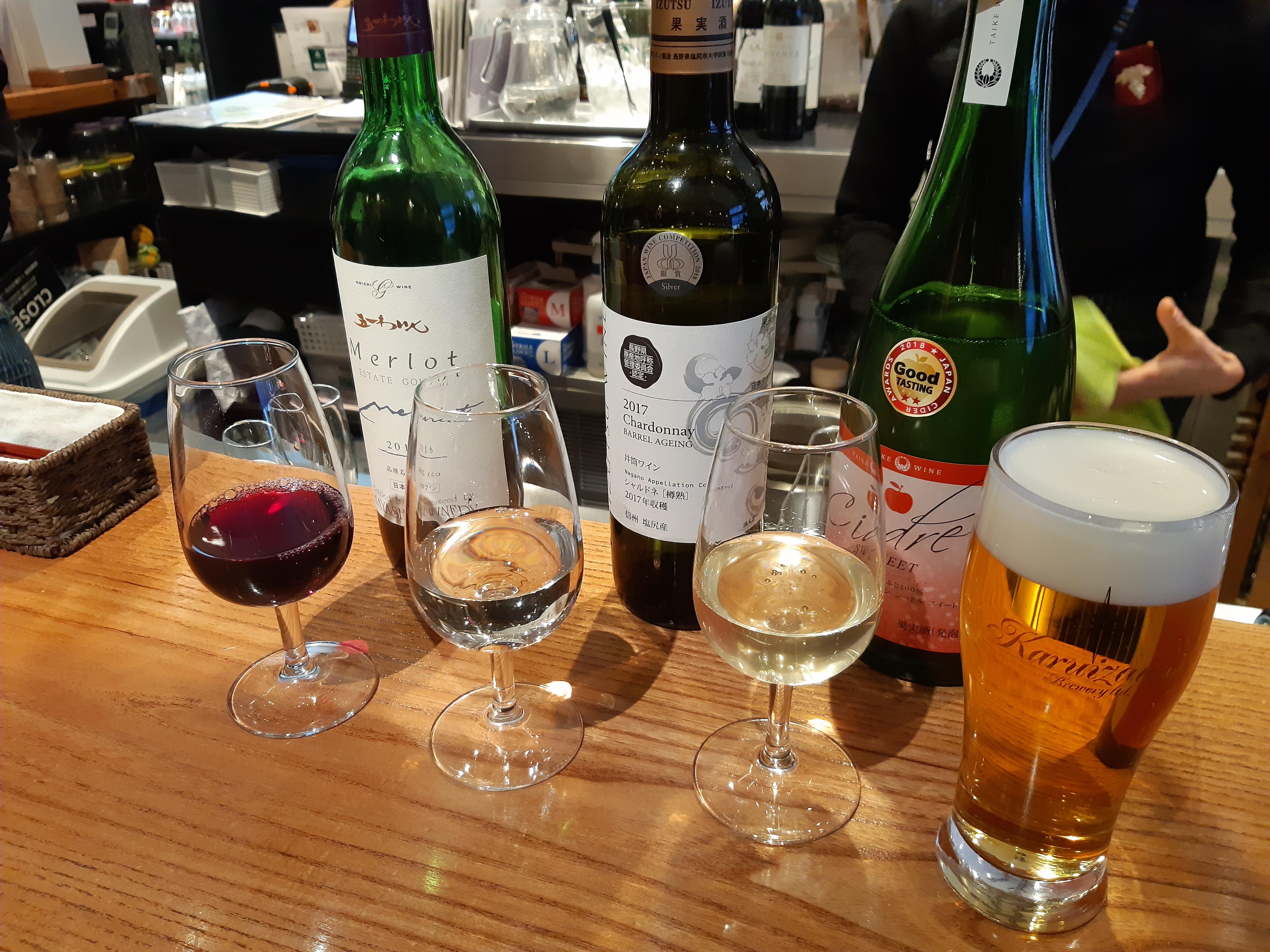 しばしこの奇跡的な出会いを喜んだ後、友人夫妻と別れ、次なる目的地・長野県のアンテナショップ『銀座ナガノ』へ向かいました。こちらに伺うのは今回が二度目で、カウンターでの有料試飲を楽しみにしていました。前回は車の運転があったので、お酒が飲めなかったんです。店内中央にある試飲カウンターでは、長野県産の地ビールや日本酒、ワイン、ウイスキーを、地元のおつまみと共に楽しむことができます。また店内で販売している冷凍『おやき』も温めてくれて、カウンターで食べることができます。日本酒とワインの三種類飲み比べセットは、お得感が満載でした!