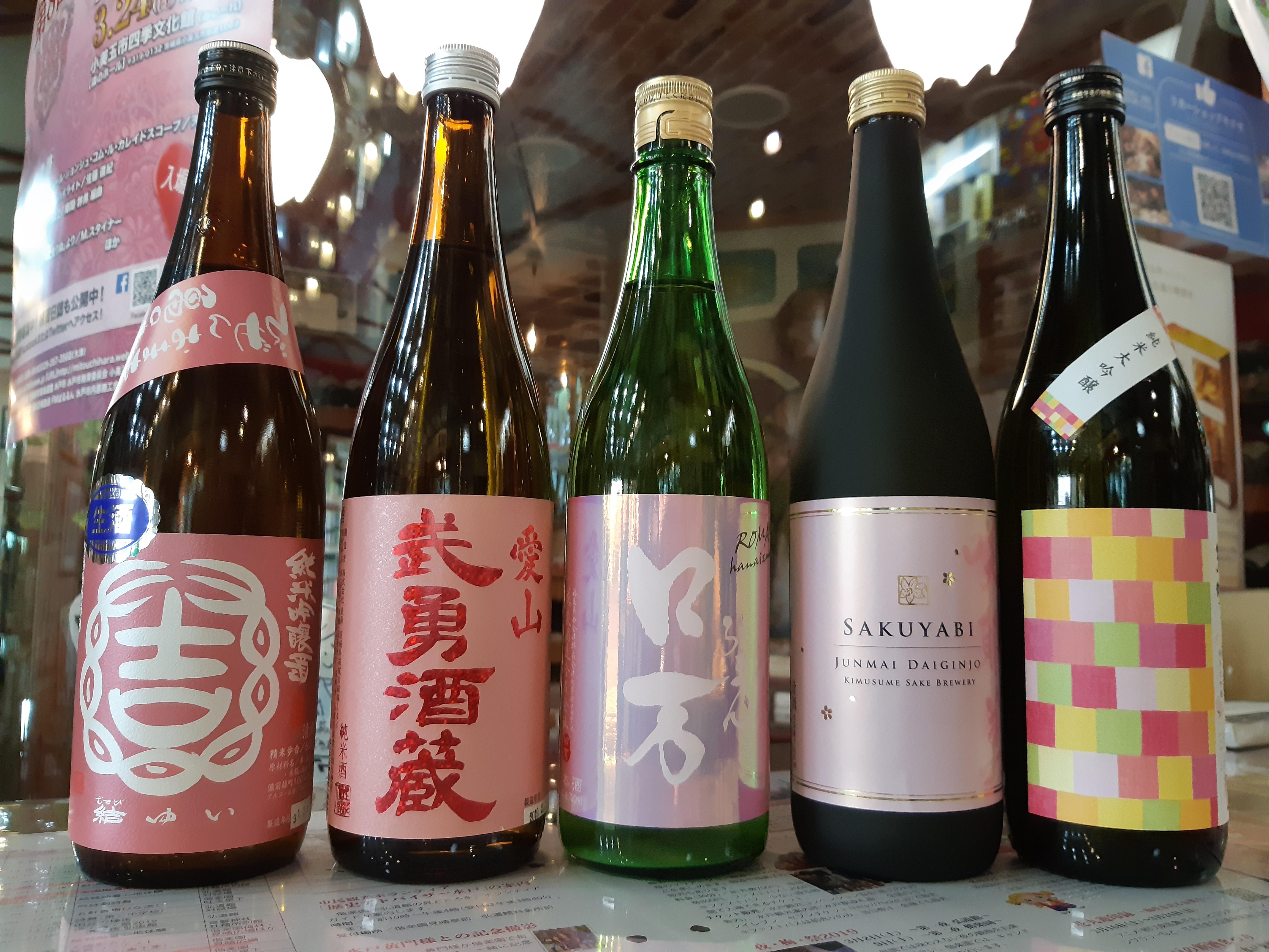 そして、ピンクのキラキラとしたホログラムラベルが素敵なお酒は、福島県の花泉酒造さんが造る『かすみロ万』です。柔らかな甘みと上品な後口のお酒です。お隣の、一見するとワインの様なボトルは、群馬県の貴娘酒造さんの『咲耶美・純米大吟醸』です。最後に、『ひなあられ』のような淡い色合いのラベルがとても可愛らしいお酒は、佐賀県の『天吹・大吟醸・春色』です。