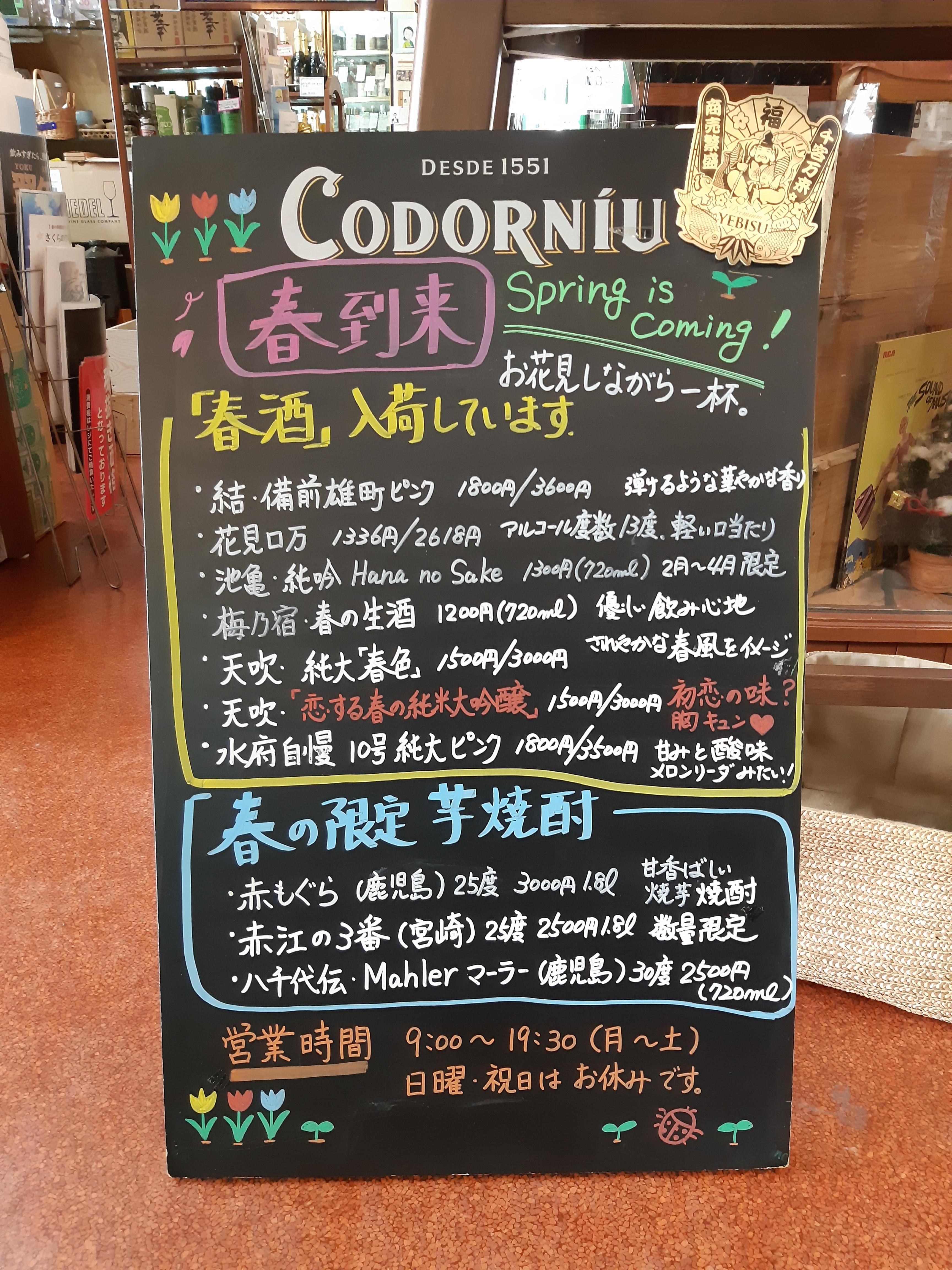 ご来店の際は、店頭の黒板と最新入荷一覧表を参考にして、春のお酒選びにお役立てください。