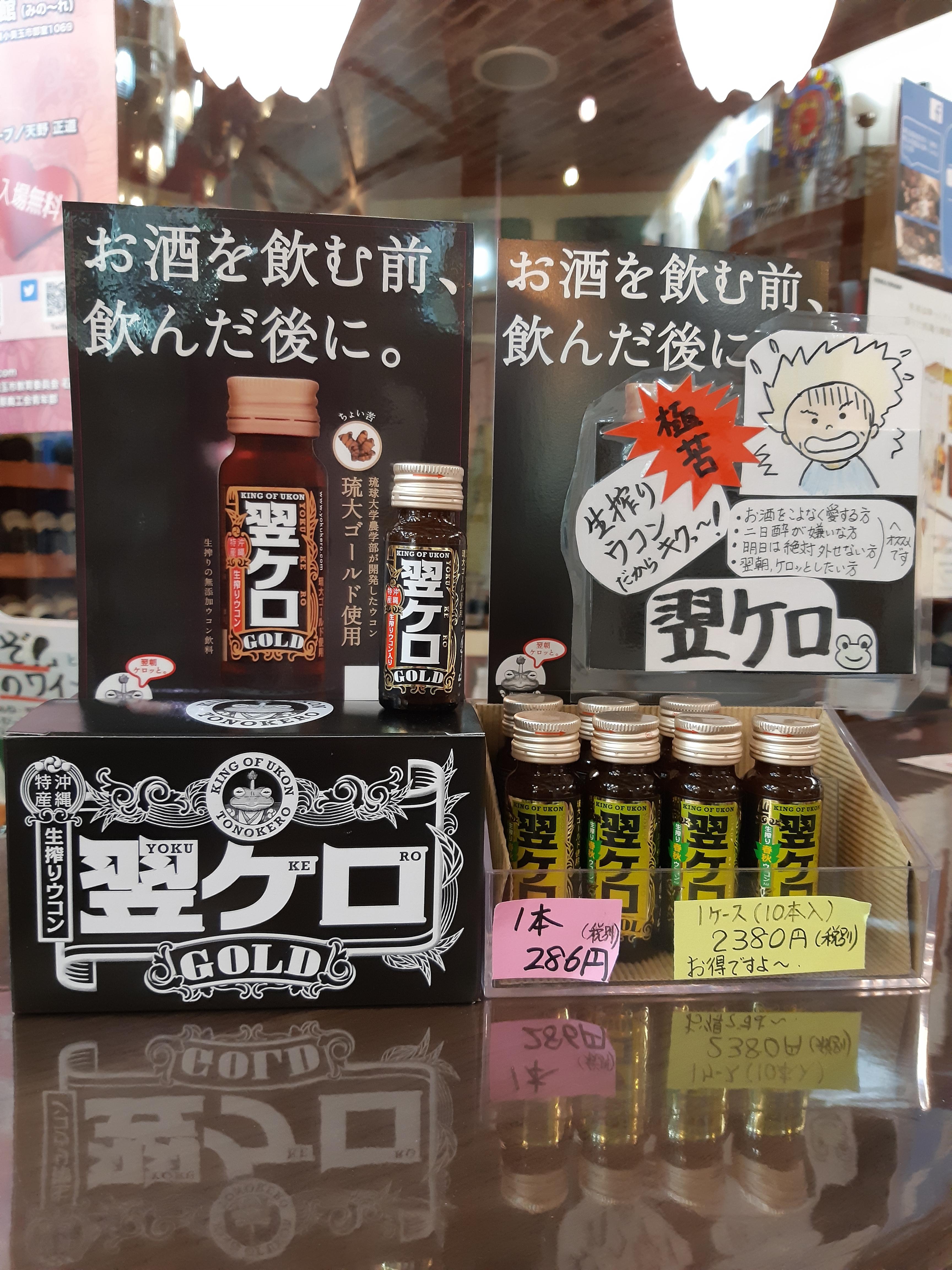 そして、なぁ~んと、この度、今までの『翌ケロ・クール』が『翌ケロ・ゴールド』になって登場してきました!今回の『翌ケロ・ゴールド』は、琉球大学農学部が開発したウコン『琉大ゴールド』を使用することで、今までの物よりも苦みが強くなった分、何となく翌日の爽快感が違うような気がします(笑)お酒を飲む前や、飲んだ後にお試しください