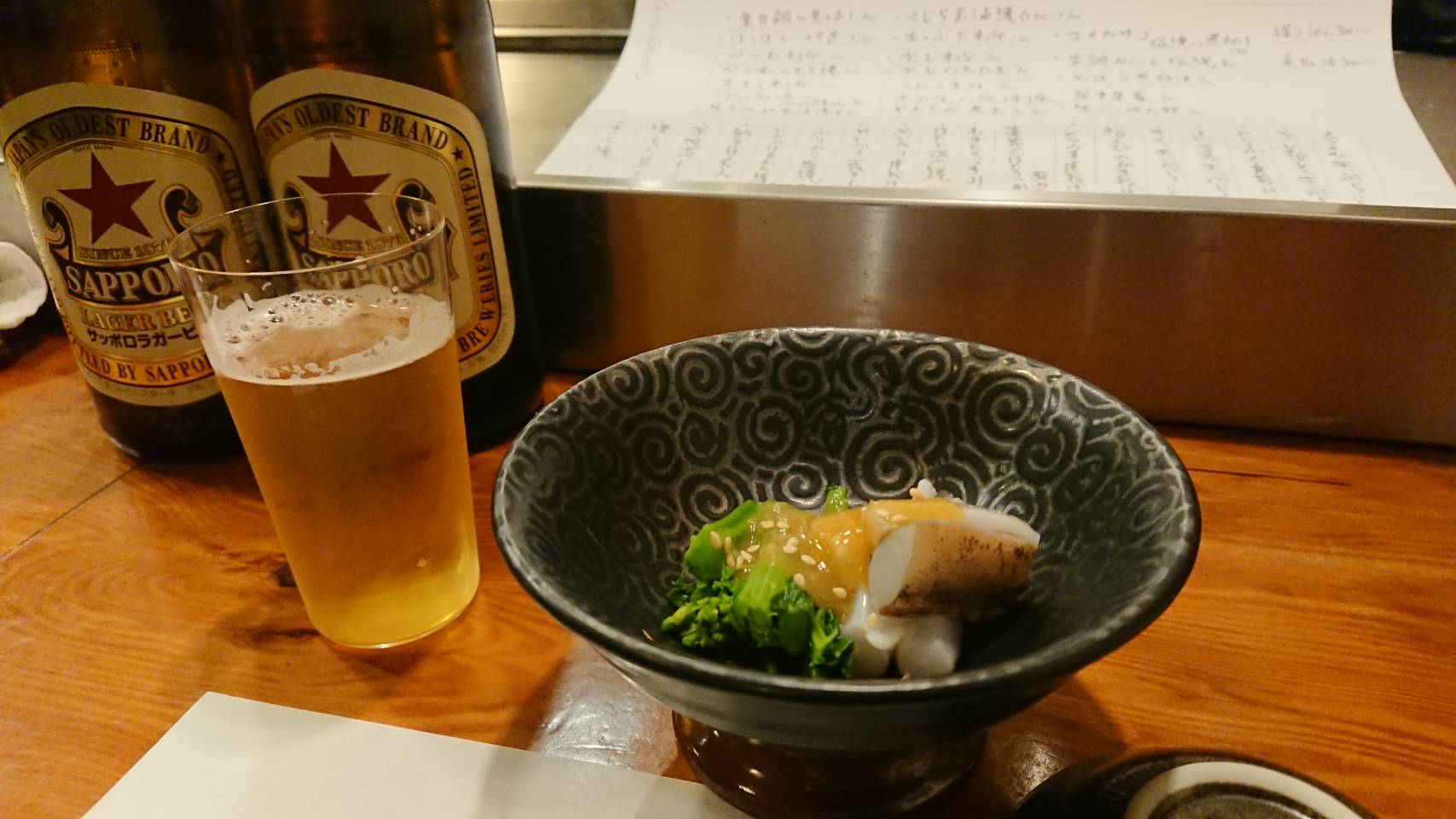 まずは、『菜の花とイカの酢味噌和え』を摘まみながらサッポロ・ラガービールで乾杯!柔らかなイカの甘味と菜の花のほろ苦さがベストマッチです。続いて、春を告げる魚『サヨリ』のお造りと皮の炙りをいただきましたが、これは酒が進んでしまいますね~(笑)