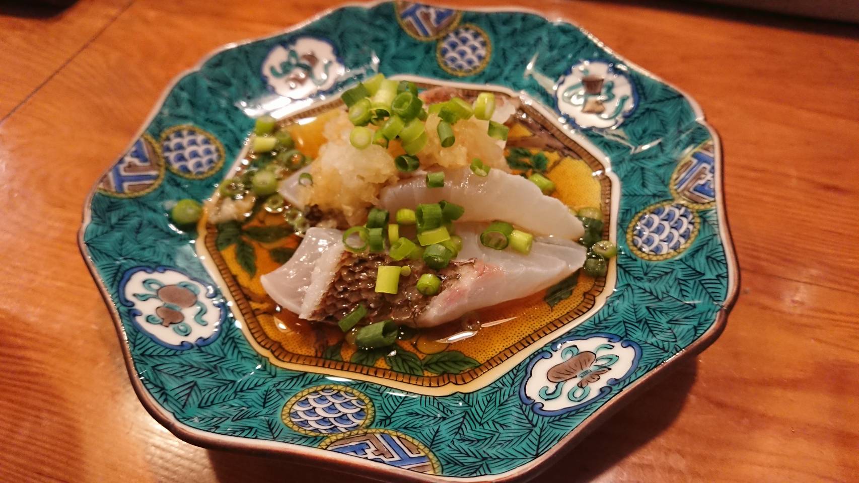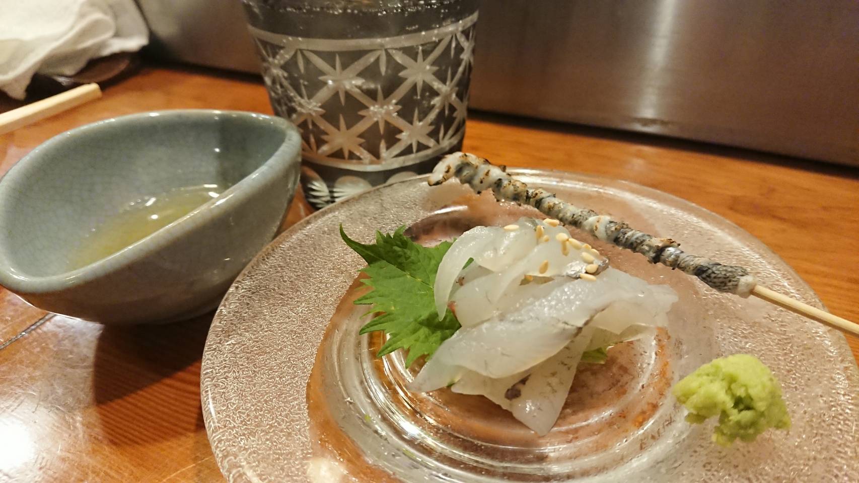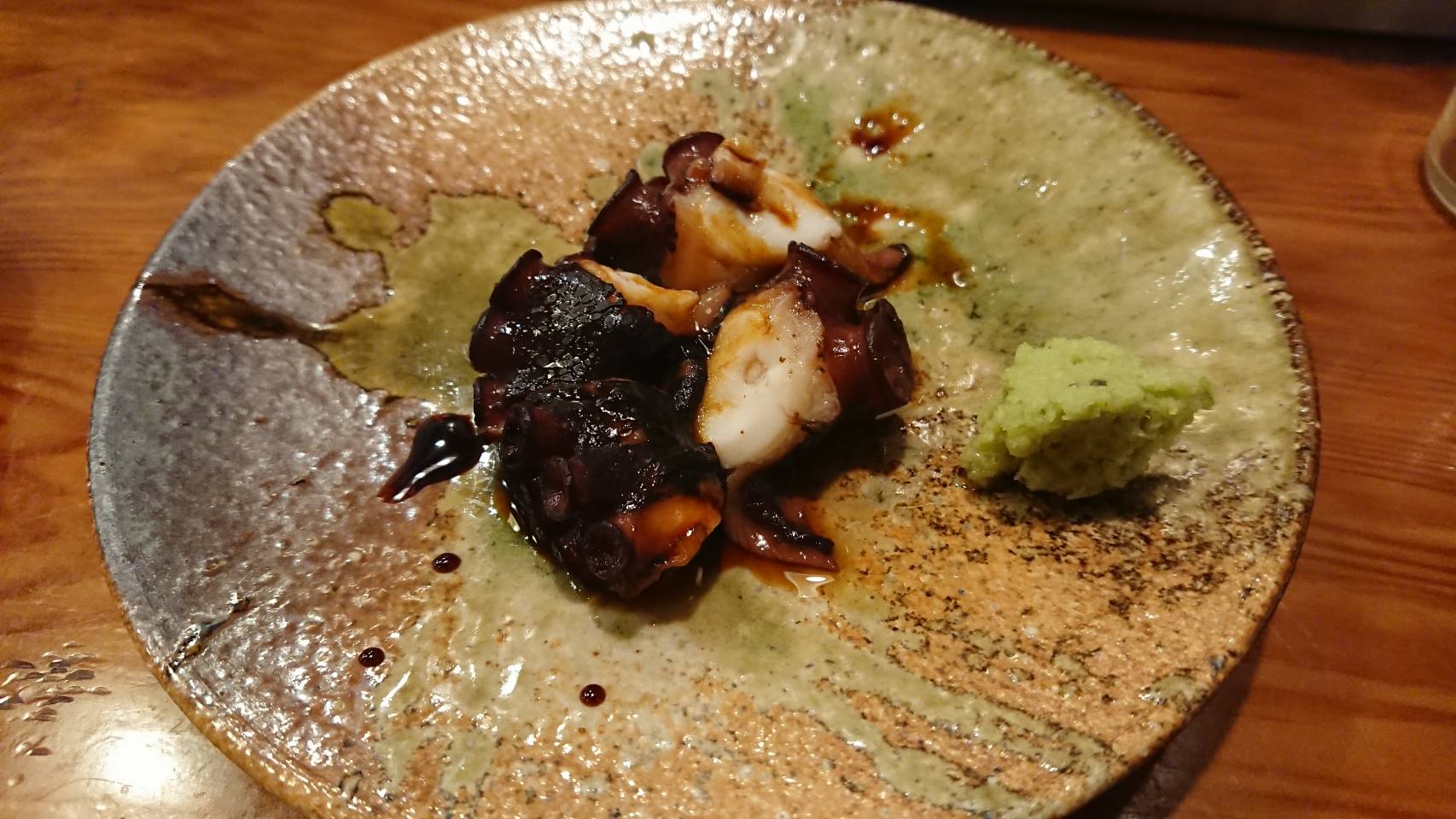 ここで、ビールから麦焼酎『無一物』のソーダ割に切り替えた所で、『金目鯛の炙り刺し』が運ばれてきました。プリっとした歯ごたえと上品な甘みが口の中に広がる逸品です。柔らかく煮込まれたタコは、口の中に入れたとたんにとろけるくらい柔らかく、見た目よりのあっさりとした味付けでした。