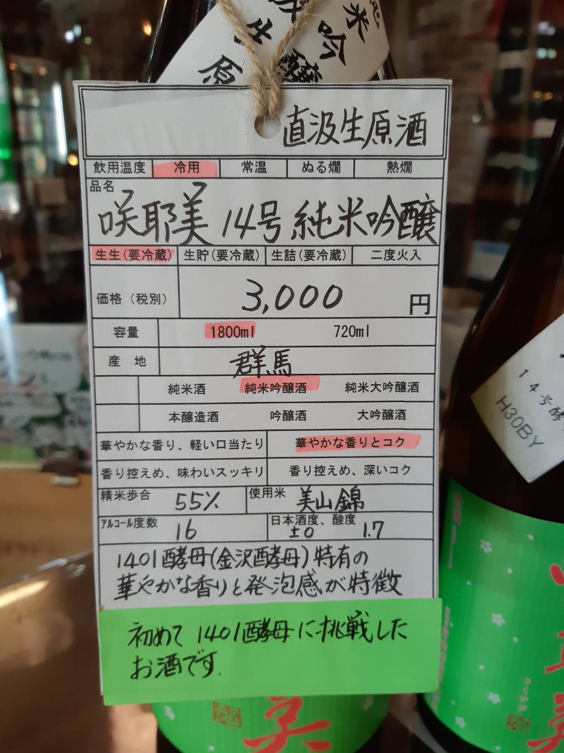 その『咲耶美ファミリー』に新しく加わったのは、目にも鮮やかな緑色の『グリーンラベル』です。今までの物と、一体何が違うのかと言いますと、原料米の『美山錦』は同じなのですが、使用している『酵母菌』が全く違うのです。ピンクラベルは『1801号酵母』、グレーラベルは『9号酵母』を使っていますが、今回の『グリーンラベル』は、蔵元として初めての挑戦となる『1401号酵母(金沢酵母)』で醸しています。