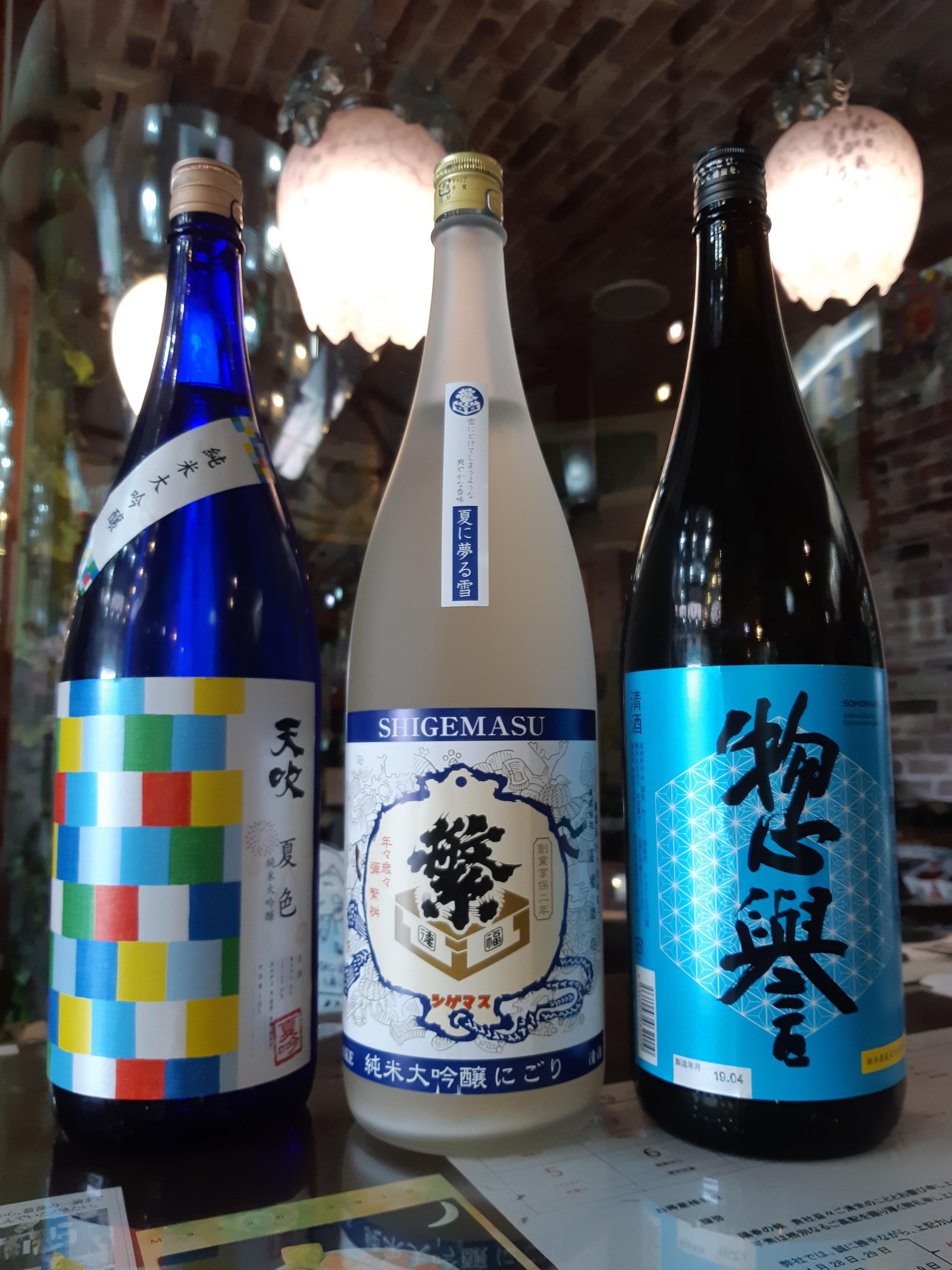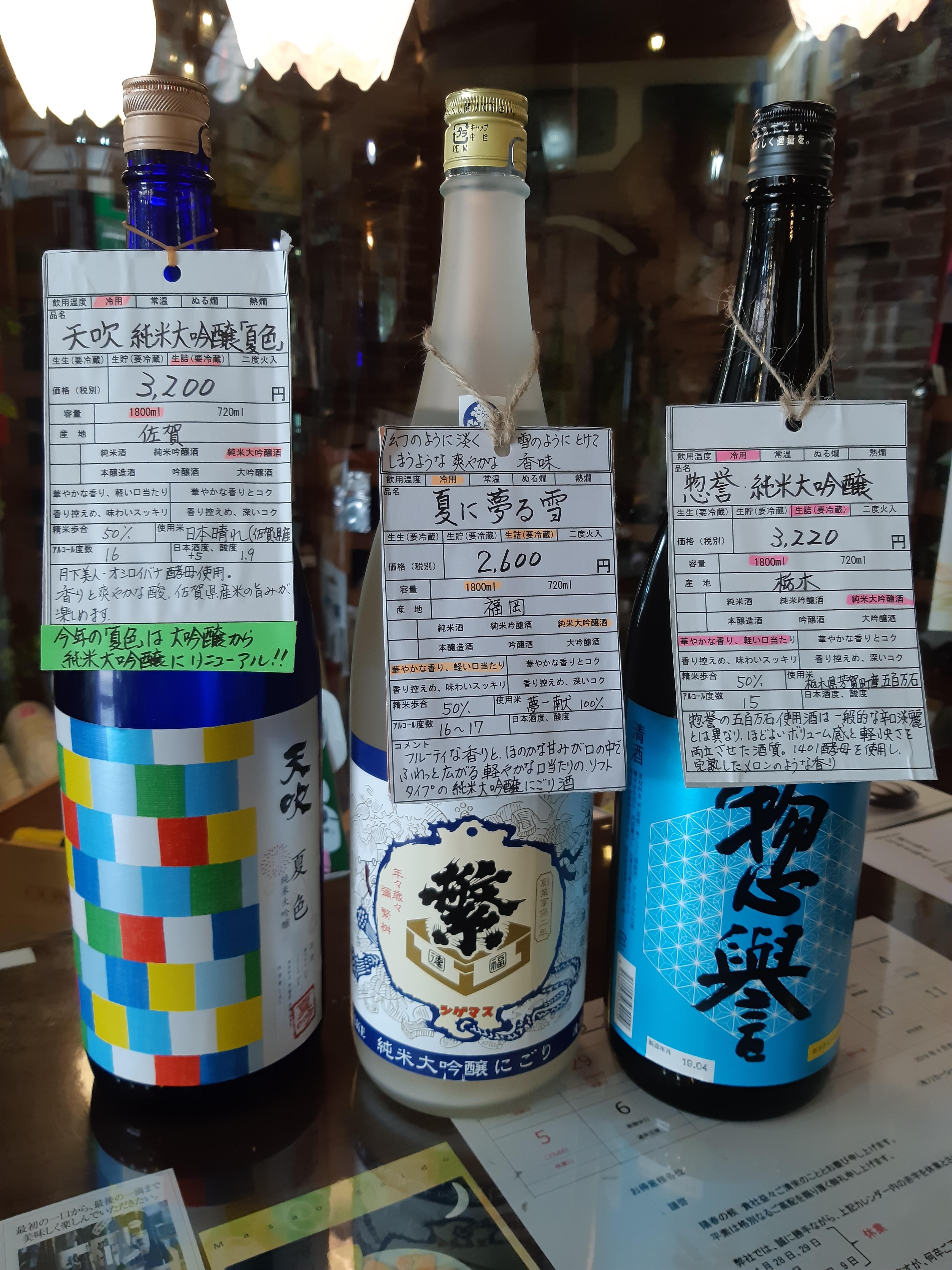 今日は、ちょっと贅沢な夏酒を三種類ご紹介させていただきました。写真は、一升瓶ですが、四合瓶(720ml)サイズも取り揃えていますので、飲み比べを楽しみたい方にもお勧めです。
