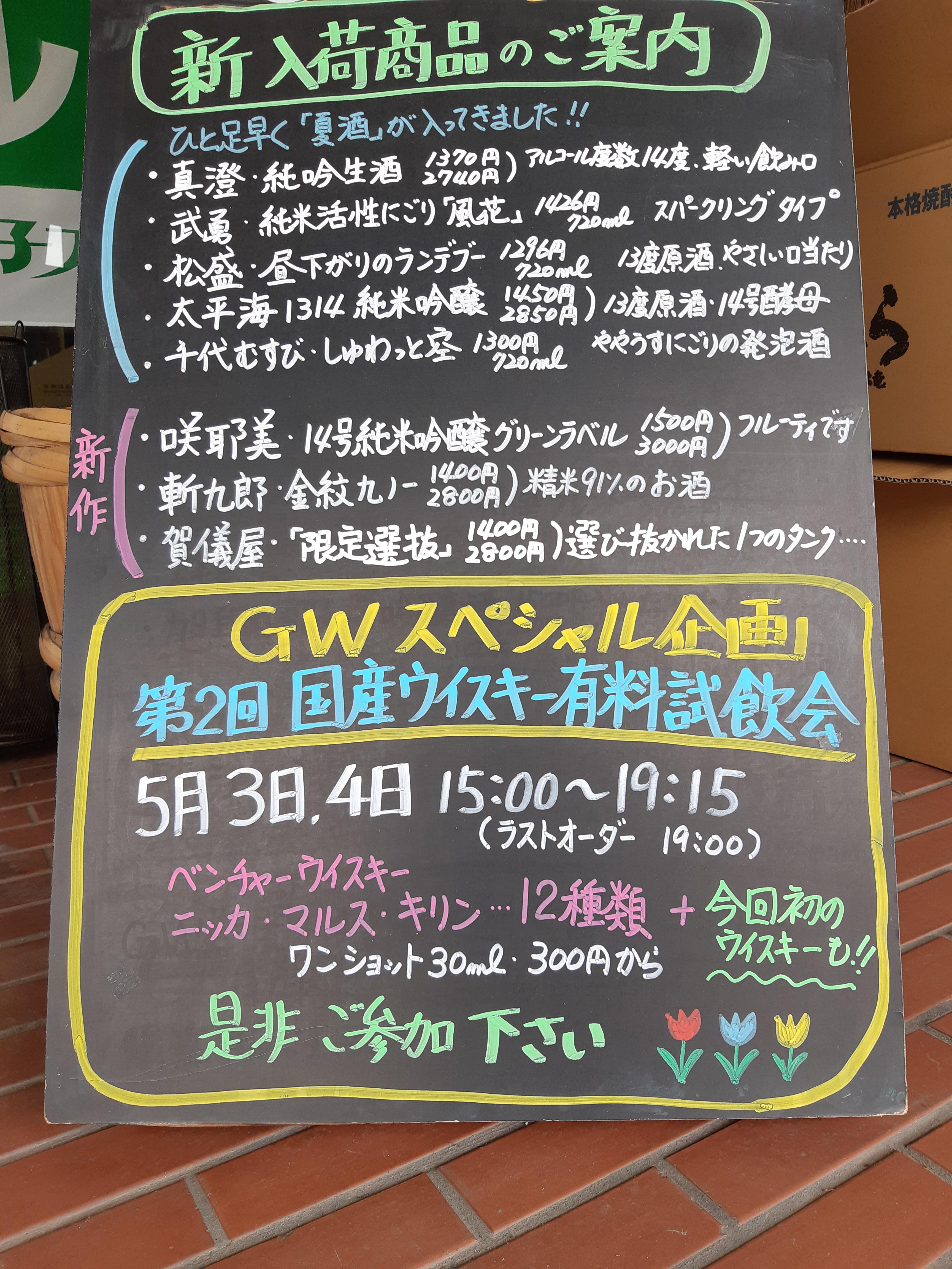 いよいよ明日に迫ったゴーデンウイークのスペシャル企画『国産ウイスキー有料試飲会、第二弾』ですが、とっても嬉しいことに、すでに沢山の方々からご参加のお申込みをいただいています。今回は、新元号『令和』を記念して、前回とは違った秘蔵ウイスキーの飲み比べセットもご用意していますので、是非、楽しみにしてください。