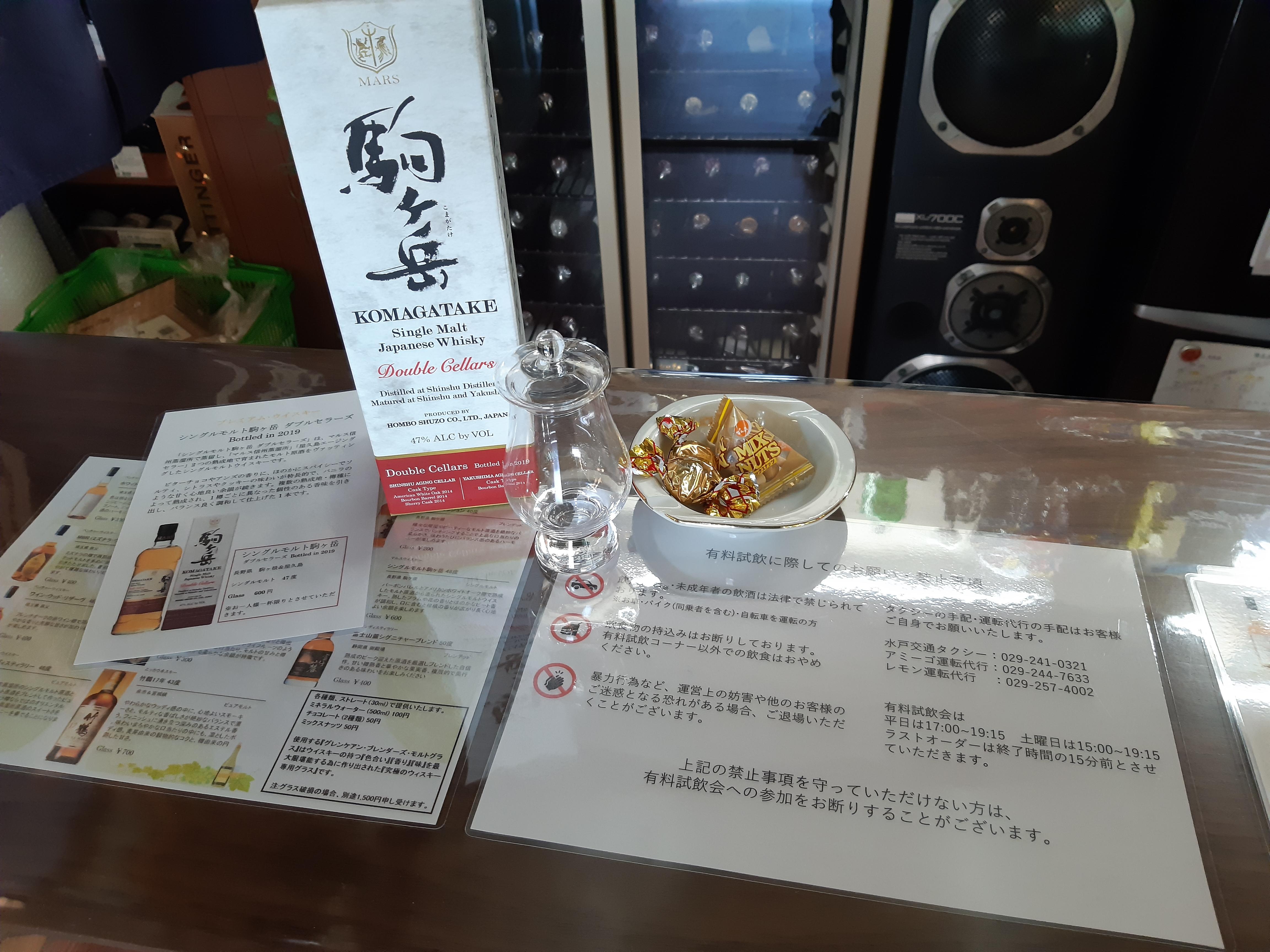 今回は、ゴールデンウイーク期間中という事で、沢山の方がお見えになった時のために、店内の試飲スペースを前回よりも広くご用意させて頂こうと思っています。各人が、ウイスキーグラスとミネラルウォーター、そしてナッツやチョコのおつまみ皿を1セットとしてご利用になられ、中には複数のウイスキーを同時に味わう方などもいるため、お一人のスペースに余裕を持たせられればと、思っていますが、何分に狭い店内ですので、ご容赦頂けましたら、ありがたいです。