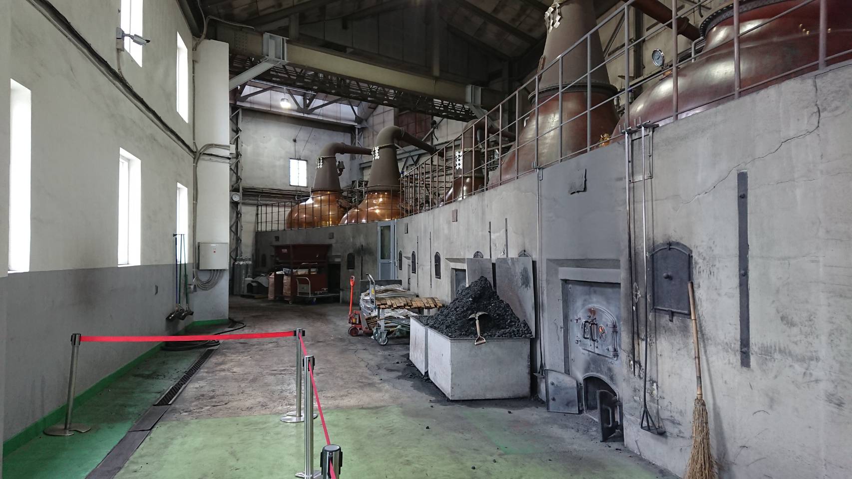 この『蒸溜所ガイドツアー』は自然豊かな広大な敷地に沢山の施設や建物が建つウイスキーのテーマパークを初めて訪問される方にとっては、ニッカウヰスキーの歴史や余市蒸溜所を知ることのできる心強い味方となってくれます。まず初めに、余市蒸溜所最大の魅力といえる『蒸溜棟』へ向かいます。余市蒸溜所では、外気温が安定している春と秋にのみウイスキーを造っているそうですので、今の時期は、世界でも希有な『石炭直火蒸溜』を行っている現場を生で見ることができる絶好の機会です。