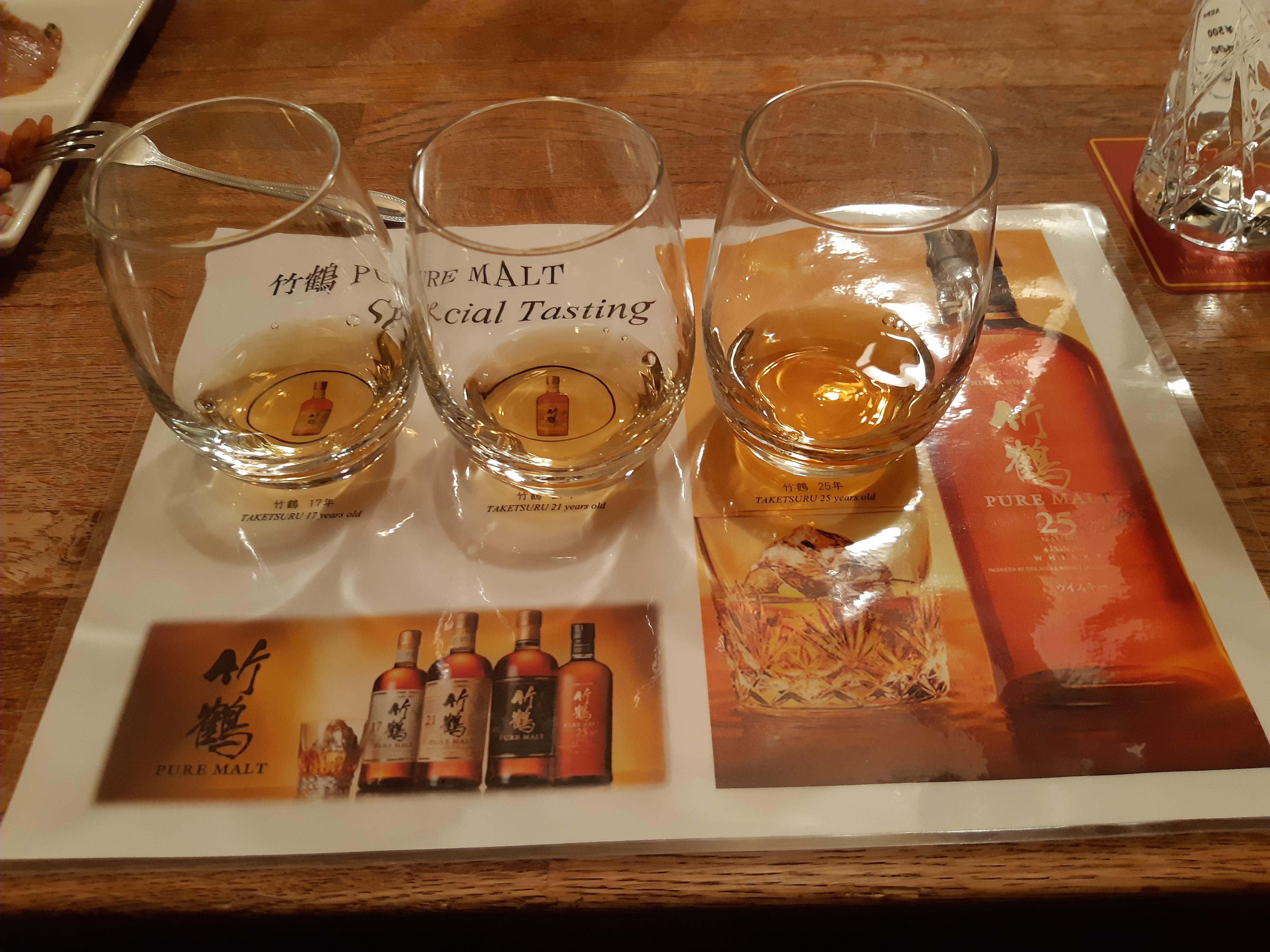 まずは、ご当地ハイボール『クレインズブーケ』と、『スーパーニッカ復刻版の水割り』を注文し、つまみには自家製の燻製(ホタテ、ニシン、クルミ)を合わせました。ワクワクしてしまう気持ちを抑えつつ、じっくりとメニューに目をやると『竹鶴ピュアモルト プレミアムテイスティングセット』が・・!17年、21年、25年が味わえるニッカファン夢の三点セットを見てしまったからには飲まずにはいられません(笑)