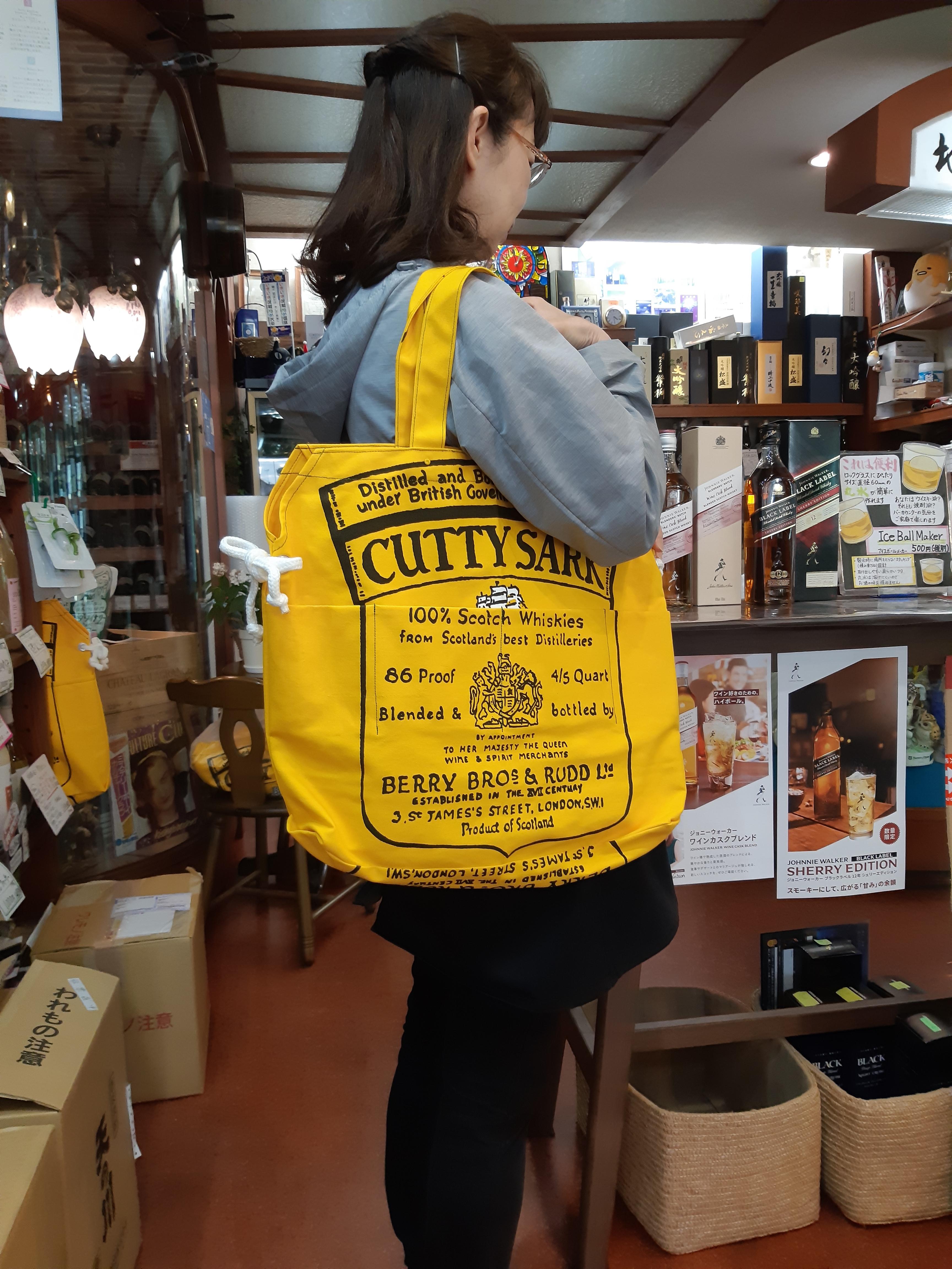 前置きがとっても長くなってしまいましたが(笑)、本日、当店オリジナルの『カティーサーク・トートバッグ』が再入荷いたしました!以前にもご紹介させていただきましたが、当店縫製担当のヌーピー先生がカティーサークのレトロエプロンをリメイクして作ったオリジナルのトートバッグです。ちなみに、今回入荷した5個限りで終わりとなります。