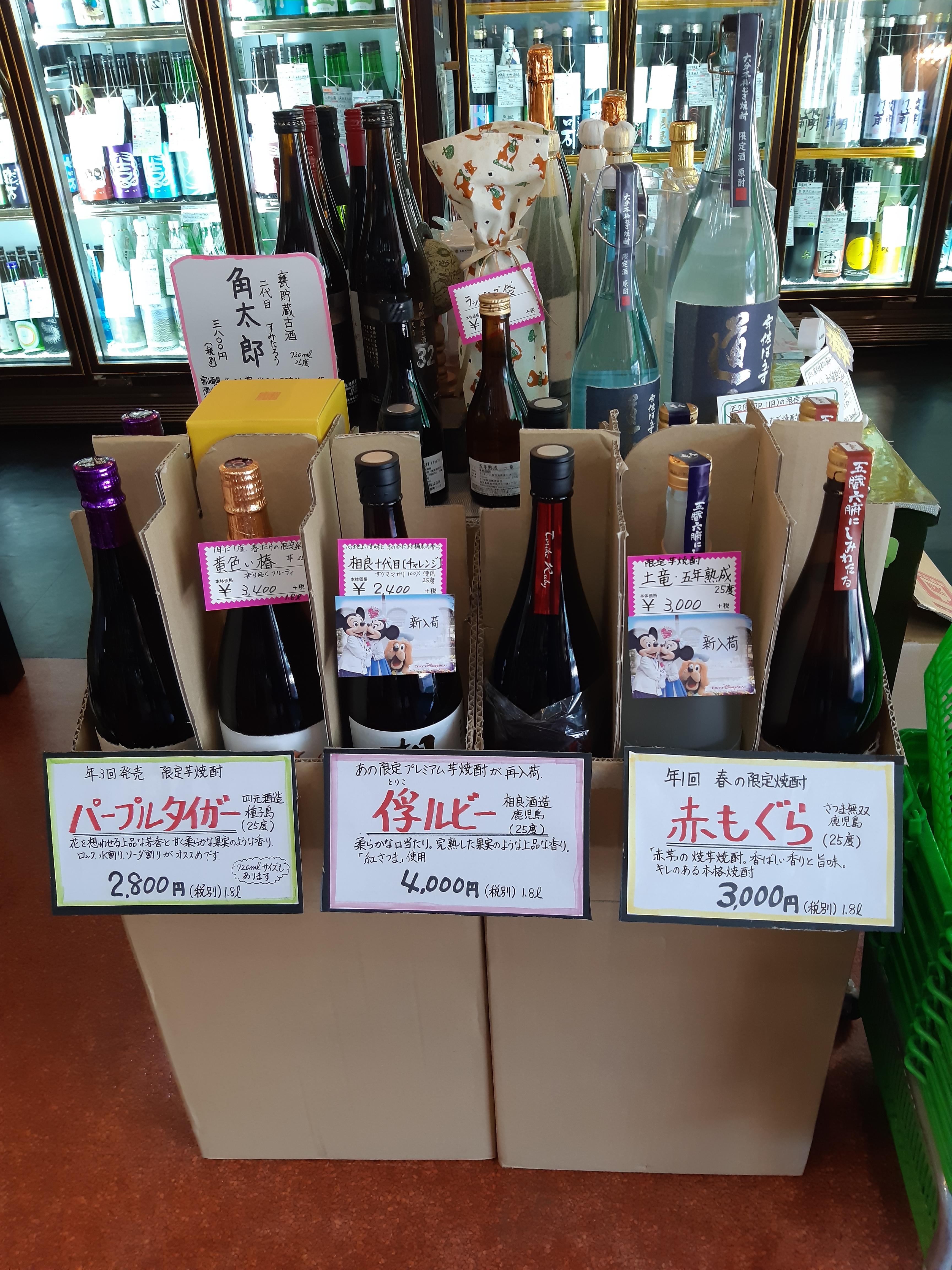 その様な限定品が集中するのが春から夏にかけての時期、ちょうど今なんです!普段、私の店では店内に入って左手の所が本格焼酎コーナーとなっていてますが、レギュラー品と限定品が混在してしまって分かり難いので、今回は、お客様が選びやすいように、店内の正面に『限定芋焼酎の特設コーナー』を作りました!今の時期のお勧めの物を一か所に並べることで、それぞれの商品を見比べられて、選びやすいのではないかと思います。