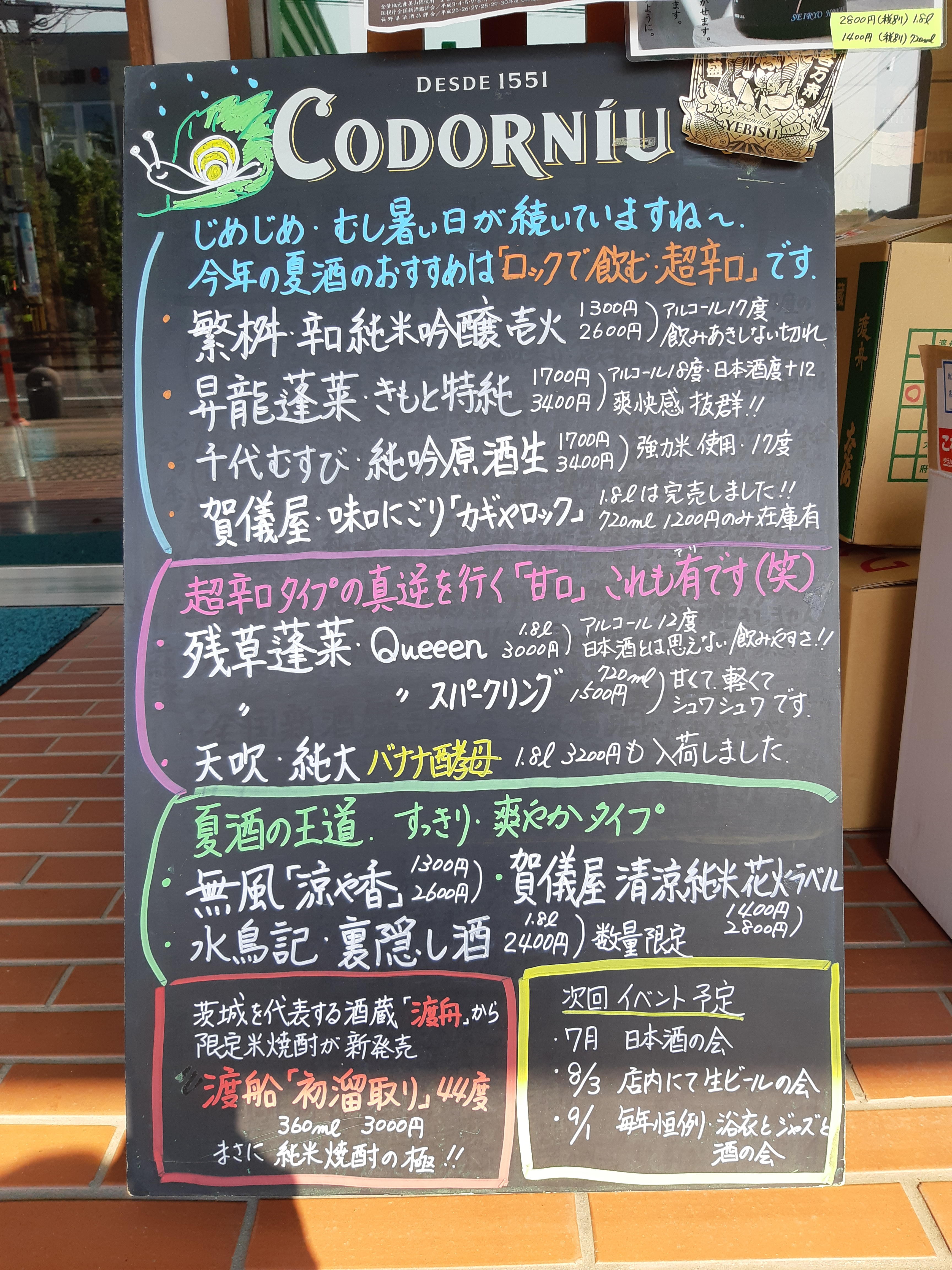 今日は梅雨の最中とは思えない夏の様な日差しが照り付ける暑い一日となりました。そこで店頭の黒板も夏バージョンのお酒を中心に書き直してみました。でも、梅雨の時期はまだまだ続くので、みどり画伯のイラストは可愛らしいカタツムリさんです(笑)。
