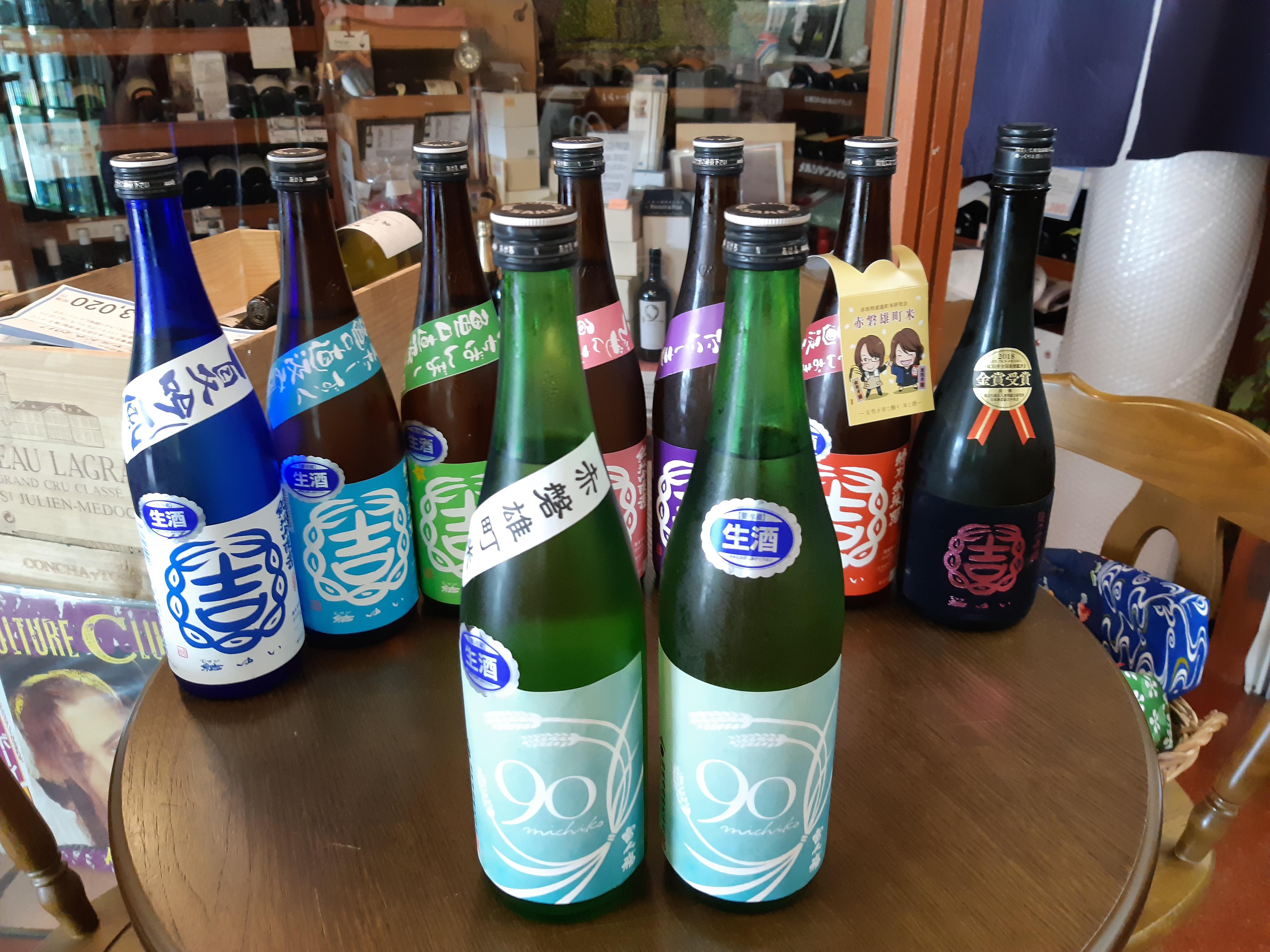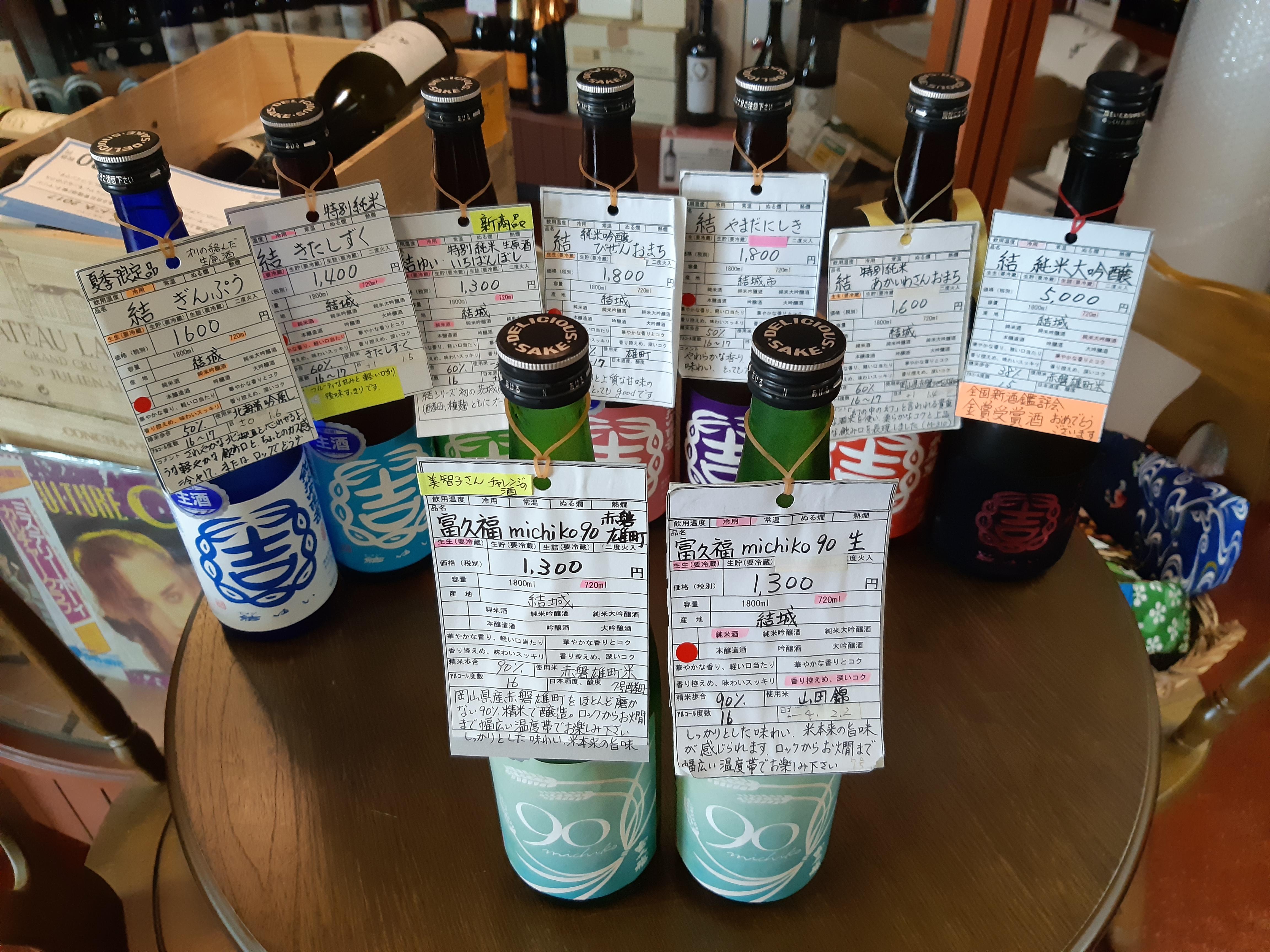 結城酒造さんの代表銘柄は、『結(ゆい)』と『富久福』の2種類で、それぞれ酵母や酒米を変えて個性あふれるお酒を造っています。現在、当店には7種類の『結』と2種類の『富久福』の合計9種類のお酒が揃っています。