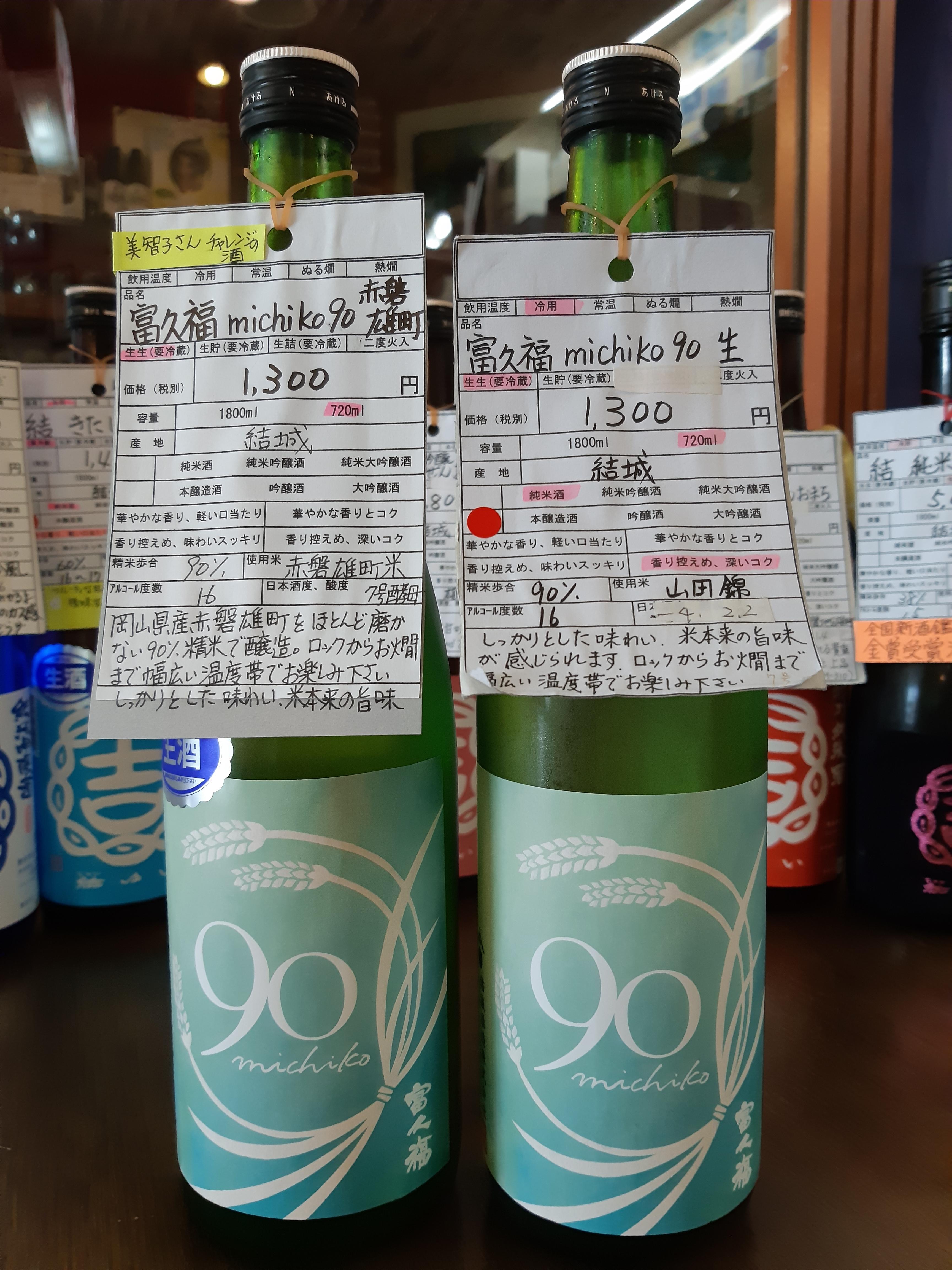『結(ゆい)』ファンの間でも、意外と知られていない『富久福 michiko 90』ですが、美智子杜氏の技術の粋が集まっていると言っても過言ではありません・・・。この機会に是非、性格の違う二人の『michiko 90』をお楽しみください。少量生産の為、品切れの際はご容赦願います。