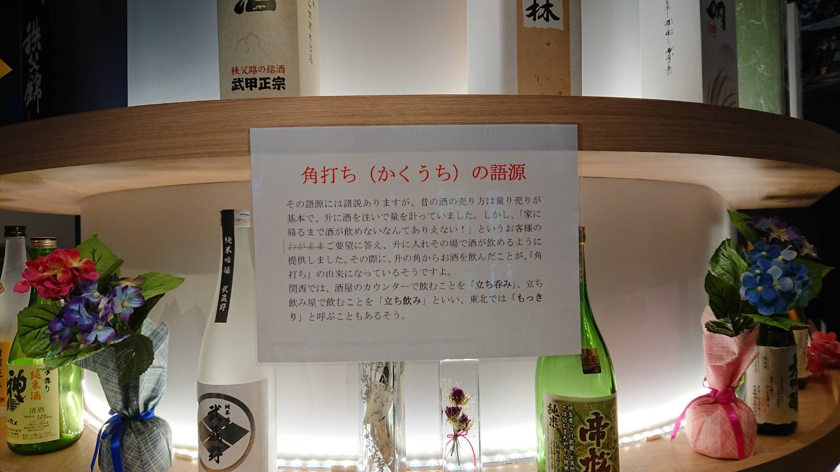 またこちらの施設では、単にお酒を飲むだけではなく、埼玉県や川越の歴史を知ることができたり、日本酒にまつわる様々なうんちくを知ることもできます。ちなみに、皆さんは『角打ち(かくうち)』の語源をご存知でしたでしょうか?正解は、写真をご覧ください!